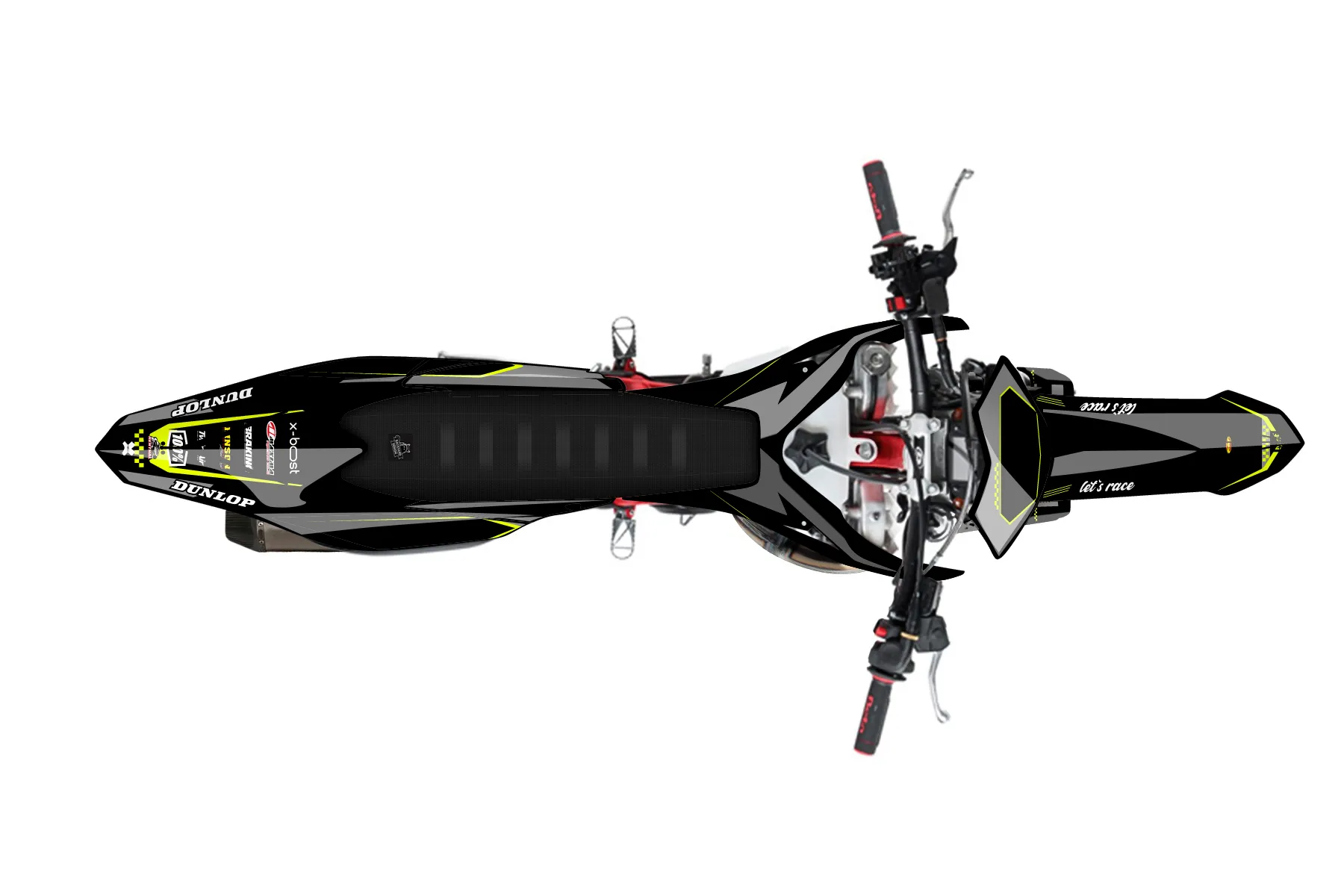 «Bright Neon» — готовый комплект графики серии Staple для Beta Enduro Graphic Kit Beta RR 300 2021. В комплекте: графика на бак и боковые облицовки, крылья (переднее и заднее), передний щиток, номерные таблички, защита вилки. Материал: ПВХ-винил 80 мкр с холодной ламинацией 300 мкр, общая толщина 380 мкр; покрытие глянцевое или матовое на выбор. Устойчив к UV-излучению, воде, бензину и мойке высокого давления. Клей акриловый на сольвентной основе — постоянный, для гибких пластиков. На простых поверхностях монтируется без нагрева; для сложных изгибов рекомендуем фен. Этот пресет можно заказать как есть или взять за основу в конструкторе: поменять цвета, добавить стартовый номер и свой бренд. Производство — 3–5 рабочих дней, доставка по России СДЭКом или Почтой, по СНГ — курьерскими службами.