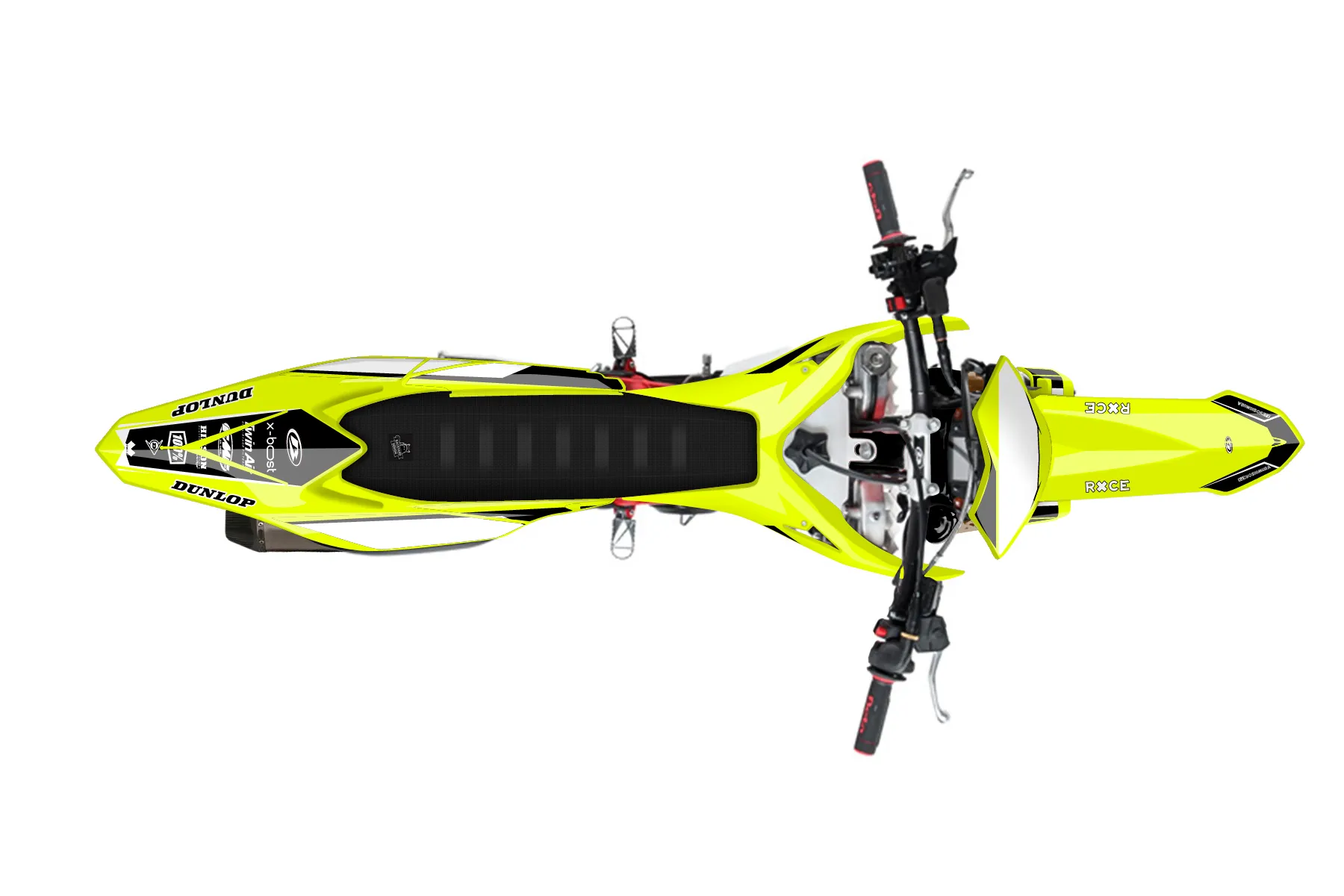 «Daze» — готовый комплект графики серии Maverick для Beta Enduro Graphic Kit Beta RR 430 2021. В комплекте: графика на бак и боковые облицовки, крылья (переднее и заднее), передний щиток, номерные таблички, защита вилки. Материал: ПВХ-винил 80 мкр с холодной ламинацией 300 мкр, общая толщина 380 мкр; покрытие глянцевое или матовое на выбор. Устойчив к UV-излучению, воде, бензину и мойке высокого давления. Клей акриловый на сольвентной основе — постоянный, для гибких пластиков. На простых поверхностях монтируется без нагрева; для сложных изгибов рекомендуем фен. Этот пресет можно заказать как есть или взять за основу в конструкторе: поменять цвета, добавить стартовый номер и свой бренд. Производство — 3–5 рабочих дней, доставка по России СДЭКом или Почтой, по СНГ — курьерскими службами.