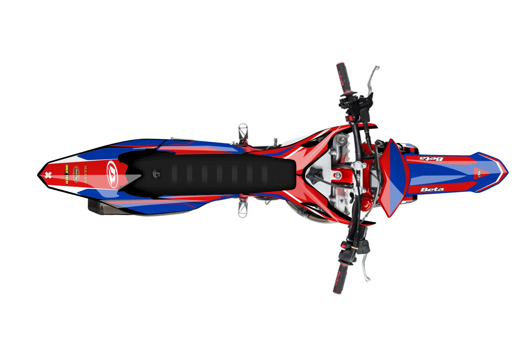 «CustomDesign» — готовый комплект графики серии Flow для Beta Enduro Graphic Kit Beta Polisport Restyle 2 stroke 2021. В комплекте: графика на бак и боковые облицовки, крылья (переднее и заднее), передний щиток, номерные таблички, защита вилки. Материал: ПВХ-винил 80 мкр с холодной ламинацией 300 мкр, общая толщина 380 мкр; покрытие глянцевое или матовое на выбор. Устойчив к UV-излучению, воде, бензину и мойке высокого давления. Клей акриловый на сольвентной основе — постоянный, для гибких пластиков. На простых поверхностях монтируется без нагрева; для сложных изгибов рекомендуем фен. Этот пресет можно заказать как есть или взять за основу в конструкторе: поменять цвета, добавить стартовый номер и свой бренд. Производство — 3–5 рабочих дней, доставка по России СДЭКом или Почтой, по СНГ — курьерскими службами.