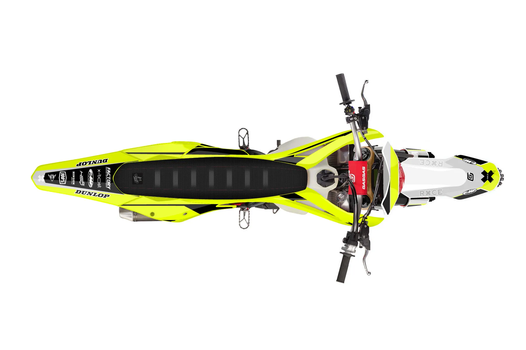 «Fluo» — готовый комплект графики серии Maverick для GasGas Enduro Graphic Kit GasGas EC 250-F 2021. В комплекте: графика на бак и боковые облицовки, крылья (переднее и заднее), передний щиток, номерные таблички, защита вилки. Материал: ПВХ-винил 80 мкр с холодной ламинацией 300 мкр, общая толщина 380 мкр; покрытие глянцевое или матовое на выбор. Устойчив к UV-излучению, воде, бензину и мойке высокого давления. Клей акриловый на сольвентной основе — постоянный, для гибких пластиков. На простых поверхностях монтируется без нагрева; для сложных изгибов рекомендуем фен. Этот пресет можно заказать как есть или взять за основу в конструкторе: поменять цвета, добавить стартовый номер и свой бренд. Производство — 3–5 рабочих дней, доставка по России СДЭКом или Почтой, по СНГ — курьерскими службами.