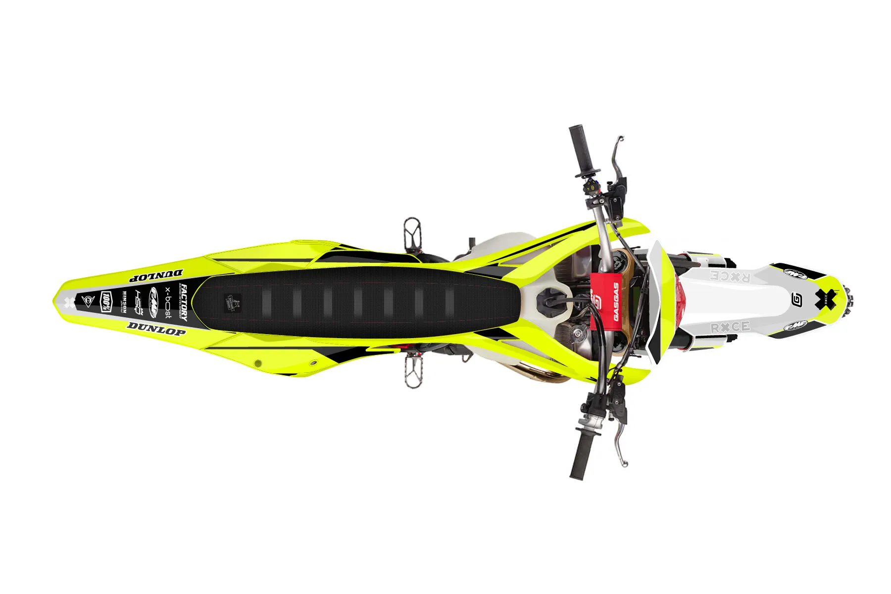 «Fluo» — готовый комплект графики серии Maverick для GasGas Enduro Graphic Kit GasGas EC 300 2021. В комплекте: графика на бак и боковые облицовки, крылья (переднее и заднее), передний щиток, номерные таблички, защита вилки. Материал: ПВХ-винил 80 мкр с холодной ламинацией 300 мкр, общая толщина 380 мкр; покрытие глянцевое или матовое на выбор. Устойчив к UV-излучению, воде, бензину и мойке высокого давления. Клей акриловый на сольвентной основе — постоянный, для гибких пластиков. На простых поверхностях монтируется без нагрева; для сложных изгибов рекомендуем фен. Этот пресет можно заказать как есть или взять за основу в конструкторе: поменять цвета, добавить стартовый номер и свой бренд. Производство — 3–5 рабочих дней, доставка по России СДЭКом или Почтой, по СНГ — курьерскими службами.