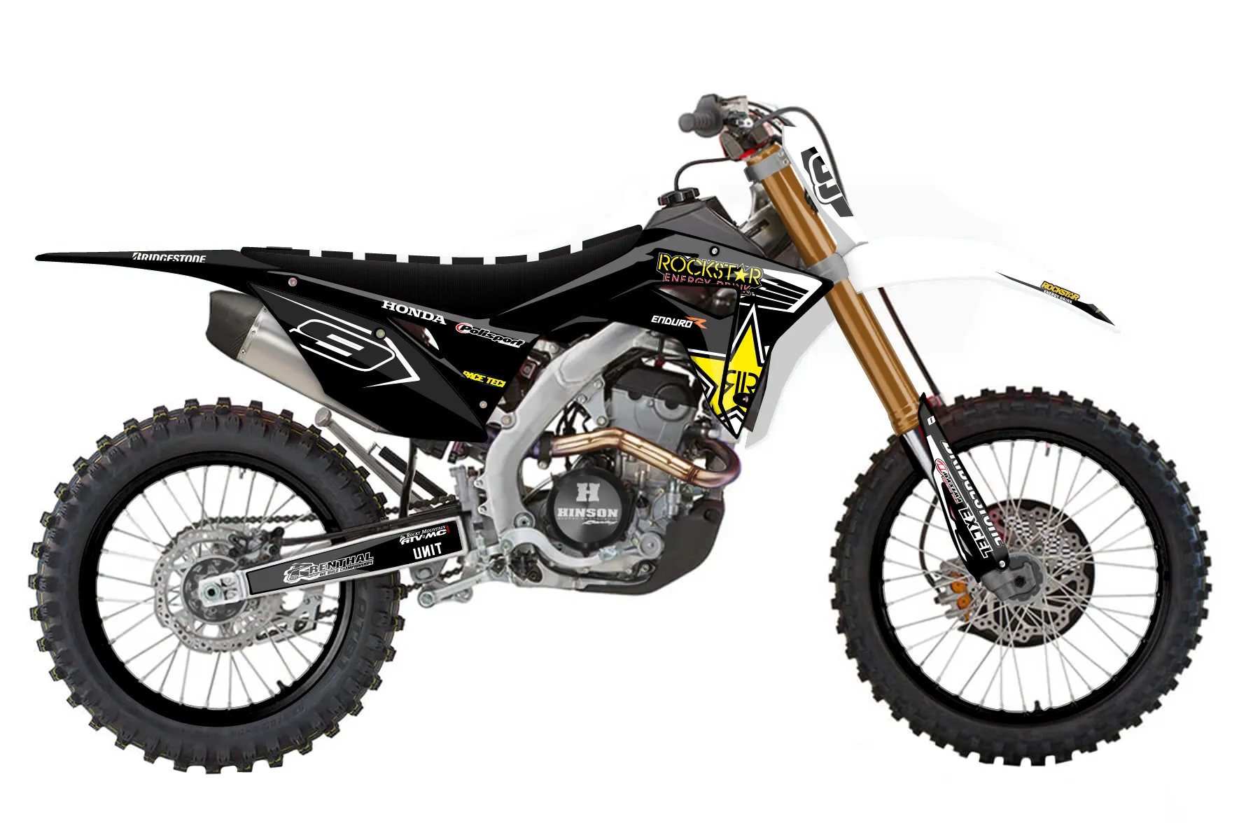 «Rockstar» — готовый комплект графики серии Staple для Honda Enduro Graphic Kit Honda CRF 250 RX 2019. В комплекте: графика на бак и боковые облицовки, крылья (переднее и заднее), передний щиток, номерные таблички, защита вилки. Материал: ПВХ-винил 80 мкр с холодной ламинацией 300 мкр, общая толщина 380 мкр; покрытие глянцевое или матовое на выбор. Устойчив к UV-излучению, воде, бензину и мойке высокого давления. Клей акриловый на сольвентной основе — постоянный, для гибких пластиков. На простых поверхностях монтируется без нагрева; для сложных изгибов рекомендуем фен. Этот пресет можно заказать как есть или взять за основу в конструкторе: поменять цвета, добавить стартовый номер и свой бренд. Производство — 3–5 рабочих дней, доставка по России СДЭКом или Почтой, по СНГ — курьерскими службами.