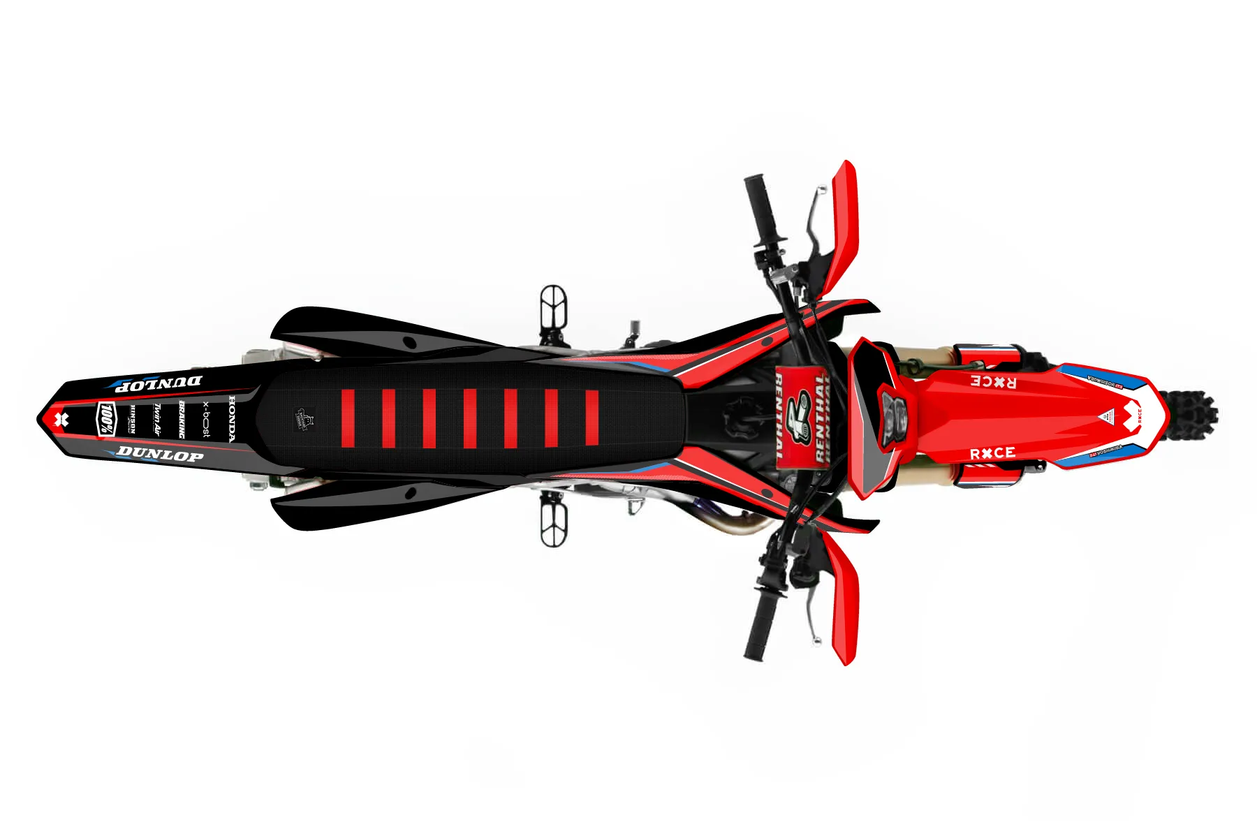 «RacerX» — готовый комплект графики серии Maverick для Honda Enduro Graphic Kit Honda CRF 450 RL 2019. В комплекте: графика на бак и боковые облицовки, крылья (переднее и заднее), передний щиток, номерные таблички, защита вилки. Материал: ПВХ-винил 80 мкр с холодной ламинацией 300 мкр, общая толщина 380 мкр; покрытие глянцевое или матовое на выбор. Устойчив к UV-излучению, воде, бензину и мойке высокого давления. Клей акриловый на сольвентной основе — постоянный, для гибких пластиков. На простых поверхностях монтируется без нагрева; для сложных изгибов рекомендуем фен. Этот пресет можно заказать как есть или взять за основу в конструкторе: поменять цвета, добавить стартовый номер и свой бренд. Производство — 3–5 рабочих дней, доставка по России СДЭКом или Почтой, по СНГ — курьерскими службами.