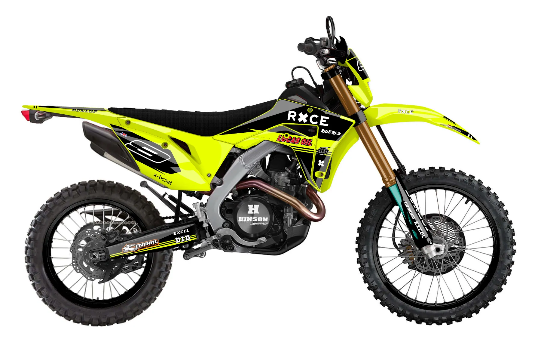 «Style Neon» — готовый комплект графики серии Untucked для Honda Enduro Graphic Kit Honda CRF 450 RL 2019. В комплекте: графика на бак и боковые облицовки, крылья (переднее и заднее), передний щиток, номерные таблички, защита вилки. Материал: ПВХ-винил 80 мкр с холодной ламинацией 300 мкр, общая толщина 380 мкр; покрытие глянцевое или матовое на выбор. Устойчив к UV-излучению, воде, бензину и мойке высокого давления. Клей акриловый на сольвентной основе — постоянный, для гибких пластиков. На простых поверхностях монтируется без нагрева; для сложных изгибов рекомендуем фен. Этот пресет можно заказать как есть или взять за основу в конструкторе: поменять цвета, добавить стартовый номер и свой бренд. Производство — 3–5 рабочих дней, доставка по России СДЭКом или Почтой, по СНГ — курьерскими службами.