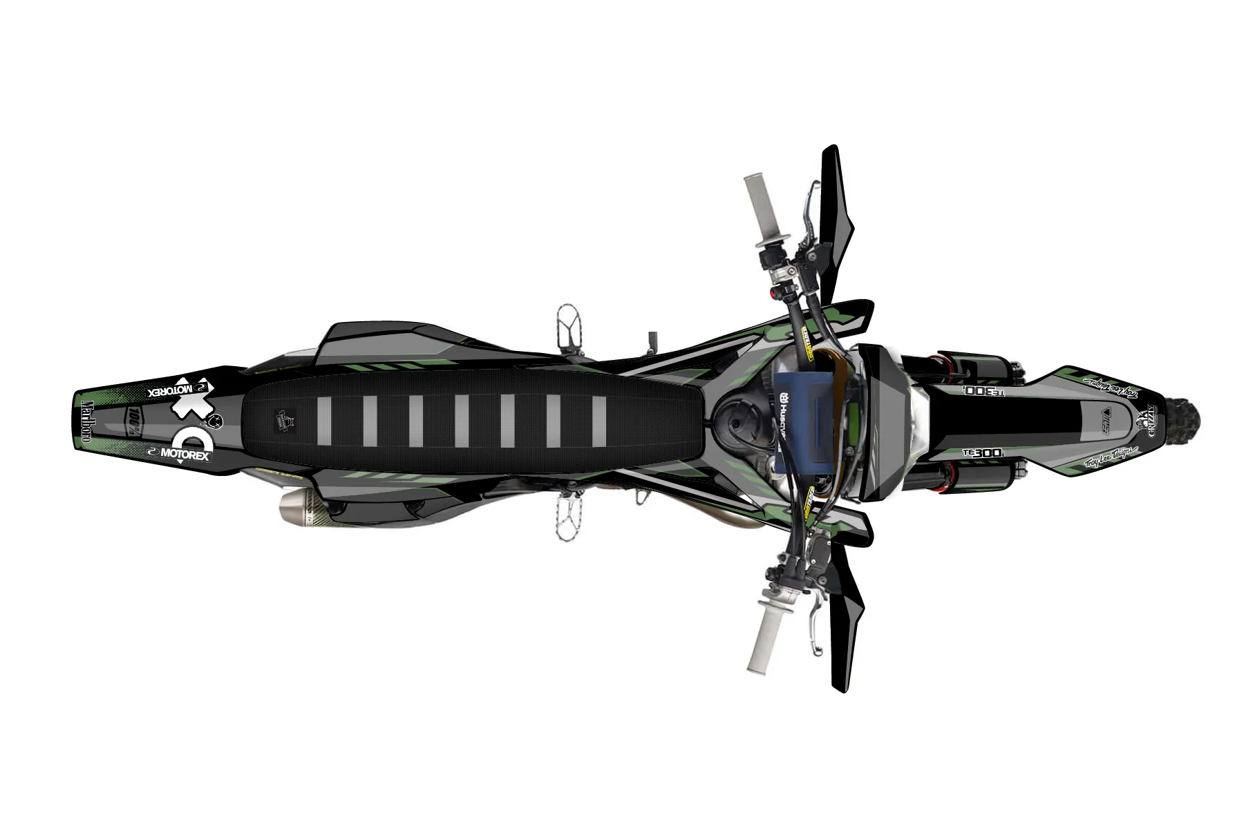 «Te300 with Green» — готовый комплект графики серии Maverick для Husqvarna Enduro Graphic Kit Husqvarna TE 300 2020. В комплекте: графика на бак и боковые облицовки, крылья (переднее и заднее), передний щиток, номерные таблички, защита вилки. Материал: ПВХ-винил 80 мкр с холодной ламинацией 300 мкр, общая толщина 380 мкр; покрытие глянцевое или матовое на выбор. Устойчив к UV-излучению, воде, бензину и мойке высокого давления. Клей акриловый на сольвентной основе — постоянный, для гибких пластиков. На простых поверхностях монтируется без нагрева; для сложных изгибов рекомендуем фен. Этот пресет можно заказать как есть или взять за основу в конструкторе: поменять цвета, добавить стартовый номер и свой бренд. Производство — 3–5 рабочих дней, доставка по России СДЭКом или Почтой, по СНГ — курьерскими службами.