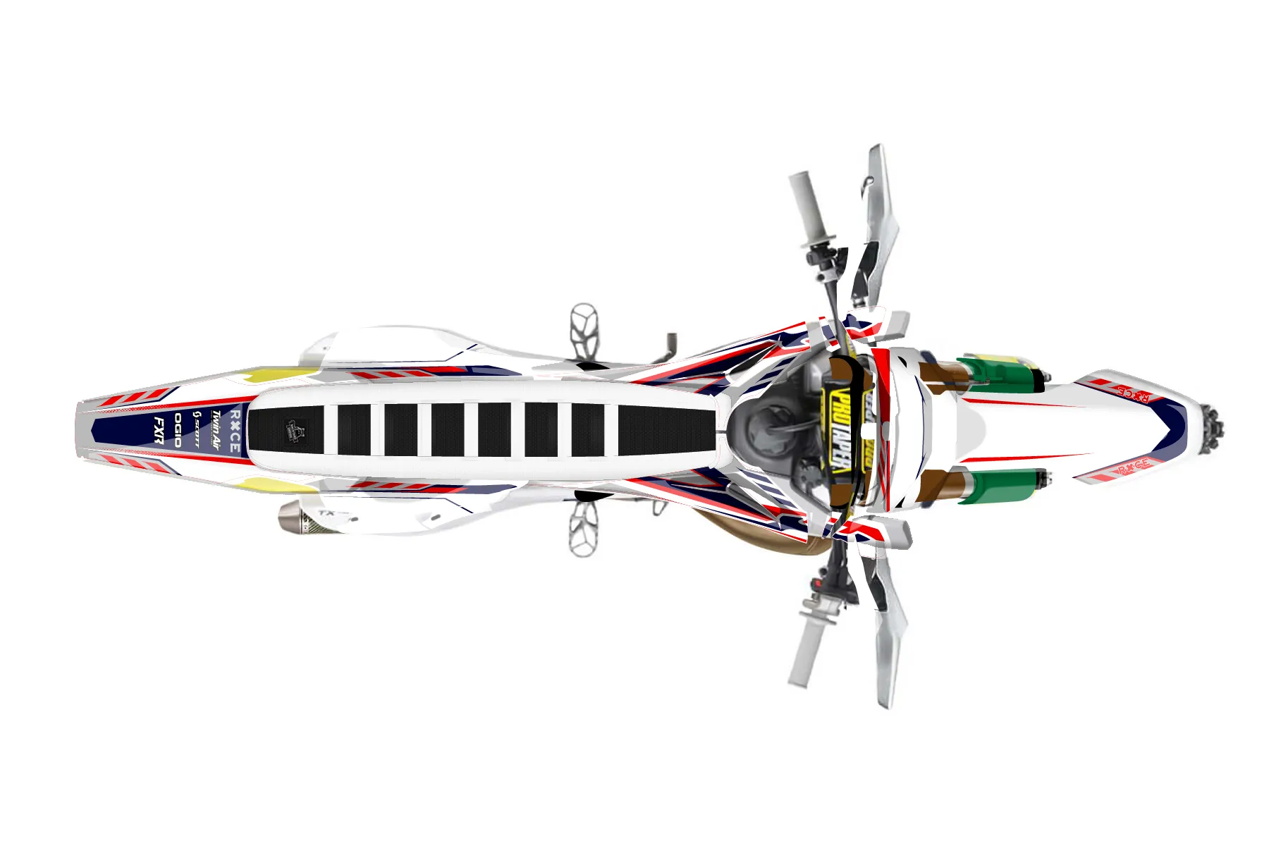 «CustomDesign 590» — готовый комплект графики серии Maverick для Husqvarna Enduro Graphic Kit Husqvarna TX 300 2019. В комплекте: графика на бак и боковые облицовки, крылья (переднее и заднее), передний щиток, номерные таблички, защита вилки. Материал: ПВХ-винил 80 мкр с холодной ламинацией 300 мкр, общая толщина 380 мкр; покрытие глянцевое или матовое на выбор. Устойчив к UV-излучению, воде, бензину и мойке высокого давления. Клей акриловый на сольвентной основе — постоянный, для гибких пластиков. На простых поверхностях монтируется без нагрева; для сложных изгибов рекомендуем фен. Этот пресет можно заказать как есть или взять за основу в конструкторе: поменять цвета, добавить стартовый номер и свой бренд. Производство — 3–5 рабочих дней, доставка по России СДЭКом или Почтой, по СНГ — курьерскими службами.