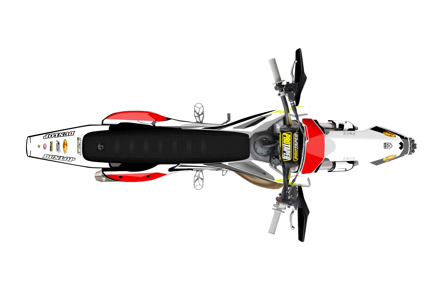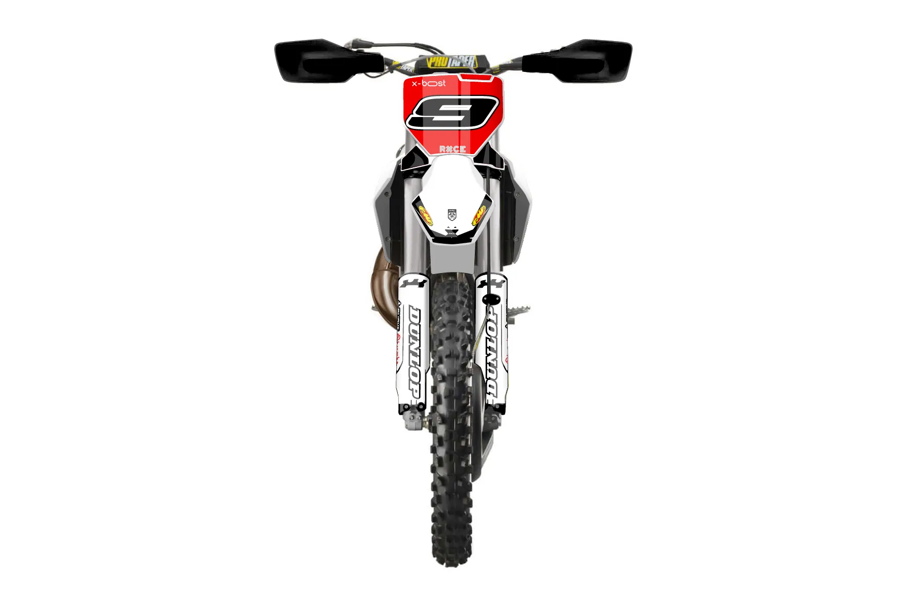 «CustomDesign» — готовый комплект графики серии Staple для Husqvarna Enduro Graphic Kit Husqvarna TX 300 2023. В комплекте: графика на бак и боковые облицовки, крылья (переднее и заднее), передний щиток, номерные таблички, защита вилки. Материал: ПВХ-винил 80 мкр с холодной ламинацией 300 мкр, общая толщина 380 мкр; покрытие глянцевое или матовое на выбор. Устойчив к UV-излучению, воде, бензину и мойке высокого давления. Клей акриловый на сольвентной основе — постоянный, для гибких пластиков. На простых поверхностях монтируется без нагрева; для сложных изгибов рекомендуем фен. Этот пресет можно заказать как есть или взять за основу в конструкторе: поменять цвета, добавить стартовый номер и свой бренд. Производство — 3–5 рабочих дней, доставка по России СДЭКом или Почтой, по СНГ — курьерскими службами.