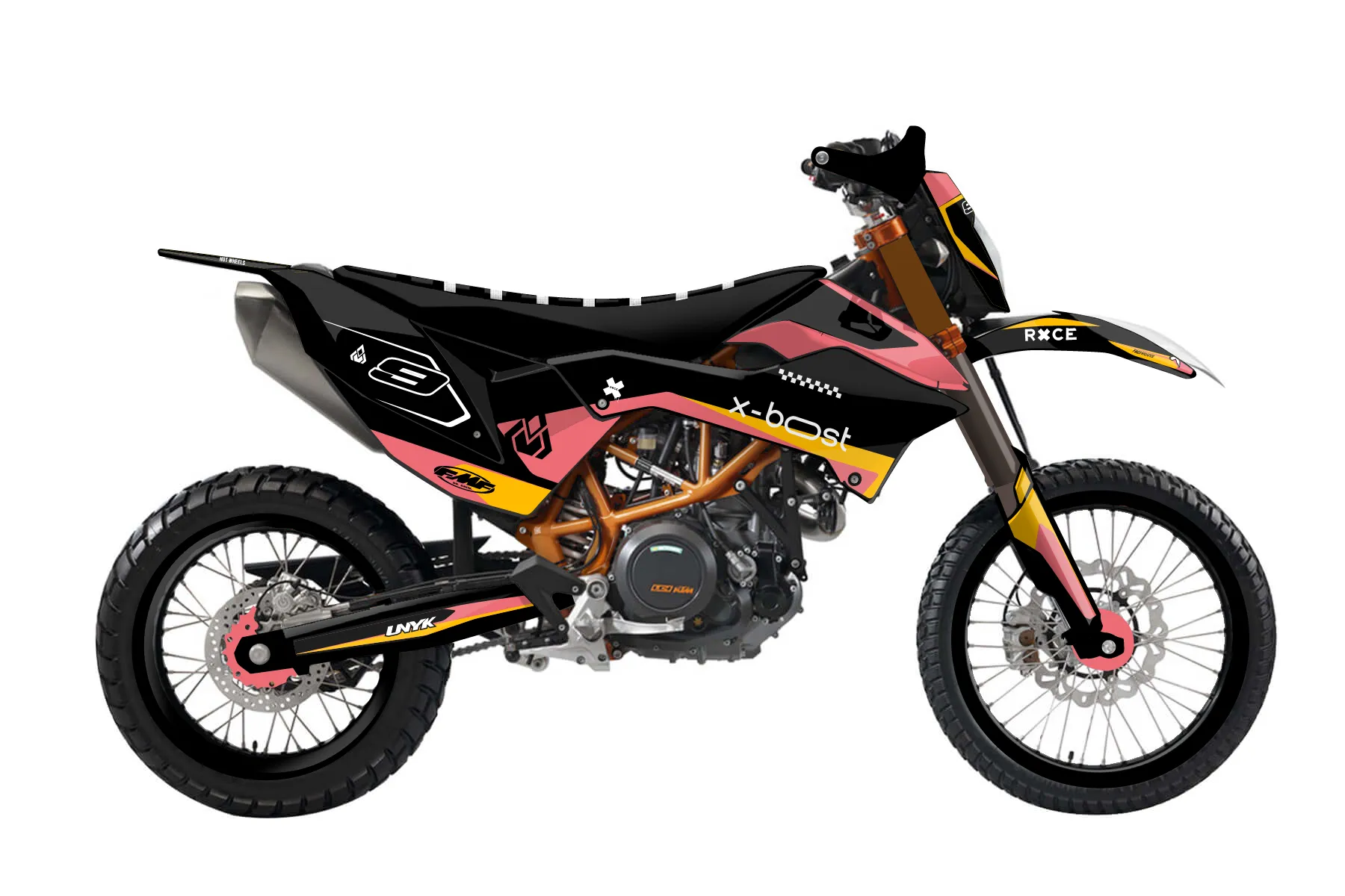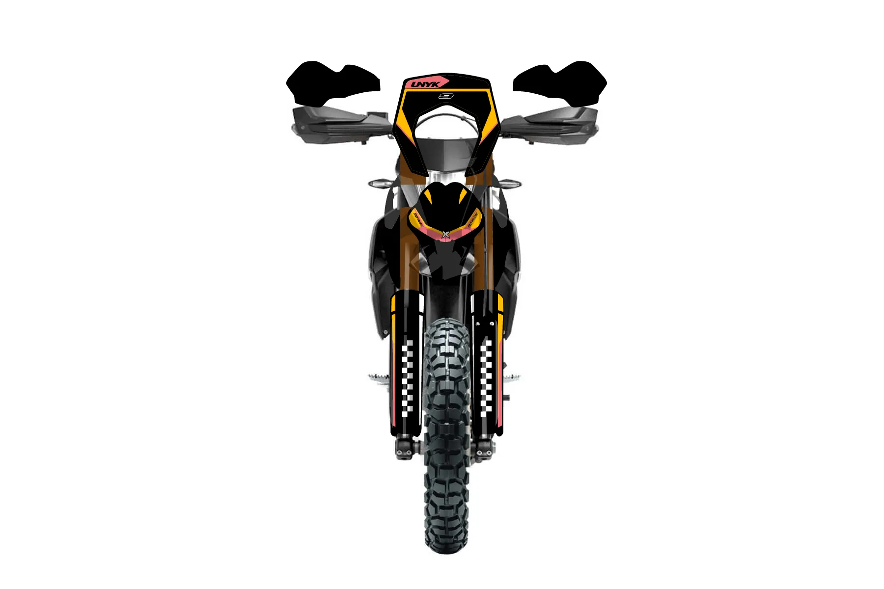 «Magnetic» — готовый комплект графики серии Flow для KTM Enduro Graphic Kit KTM Enduro-R 690 2012. В комплекте: графика на бак и боковые облицовки, крылья (переднее и заднее), передний щиток, номерные таблички, защита вилки. Материал: ПВХ-винил 80 мкр с холодной ламинацией 300 мкр, общая толщина 380 мкр; покрытие глянцевое или матовое на выбор. Устойчив к UV-излучению, воде, бензину и мойке высокого давления. Клей акриловый на сольвентной основе — постоянный, для гибких пластиков. На простых поверхностях монтируется без нагрева; для сложных изгибов рекомендуем фен. Этот пресет можно заказать как есть или взять за основу в конструкторе: поменять цвета, добавить стартовый номер и свой бренд. Производство — 3–5 рабочих дней, доставка по России СДЭКом или Почтой, по СНГ — курьерскими службами.