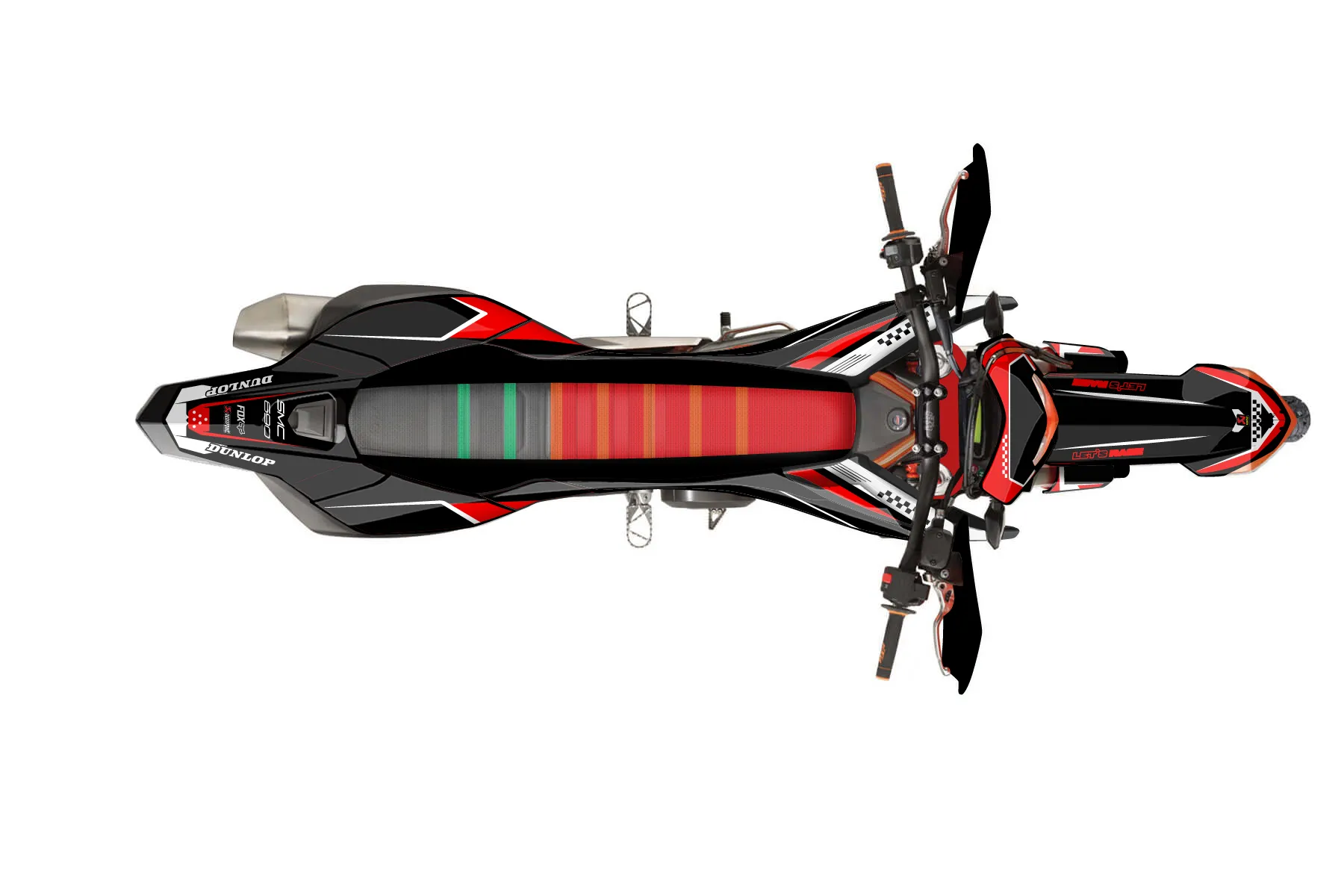 «CustomDesign» — готовый комплект графики серии Staple для KTM Enduro Graphic Kit KTM Enduro-R 690 2012. В комплекте: графика на бак и боковые облицовки, крылья (переднее и заднее), передний щиток, номерные таблички, защита вилки. Материал: ПВХ-винил 80 мкр с холодной ламинацией 300 мкр, общая толщина 380 мкр; покрытие глянцевое или матовое на выбор. Устойчив к UV-излучению, воде, бензину и мойке высокого давления. Клей акриловый на сольвентной основе — постоянный, для гибких пластиков. На простых поверхностях монтируется без нагрева; для сложных изгибов рекомендуем фен. Этот пресет можно заказать как есть или взять за основу в конструкторе: поменять цвета, добавить стартовый номер и свой бренд. Производство — 3–5 рабочих дней, доставка по России СДЭКом или Почтой, по СНГ — курьерскими службами.