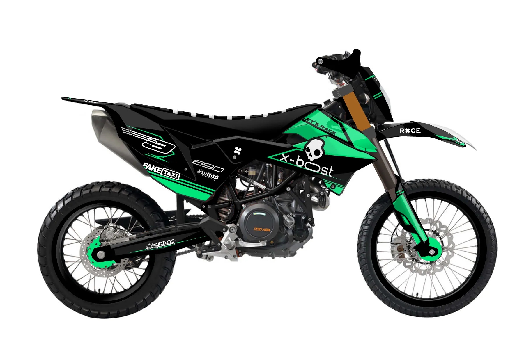 «Scoop» — готовый комплект графики серии Untucked для KTM Enduro Graphic Kit KTM Enduro-R 690 2012. В комплекте: графика на бак и боковые облицовки, крылья (переднее и заднее), передний щиток, номерные таблички, защита вилки. Материал: ПВХ-винил 80 мкр с холодной ламинацией 300 мкр, общая толщина 380 мкр; покрытие глянцевое или матовое на выбор. Устойчив к UV-излучению, воде, бензину и мойке высокого давления. Клей акриловый на сольвентной основе — постоянный, для гибких пластиков. На простых поверхностях монтируется без нагрева; для сложных изгибов рекомендуем фен. Этот пресет можно заказать как есть или взять за основу в конструкторе: поменять цвета, добавить стартовый номер и свой бренд. Производство — 3–5 рабочих дней, доставка по России СДЭКом или Почтой, по СНГ — курьерскими службами.