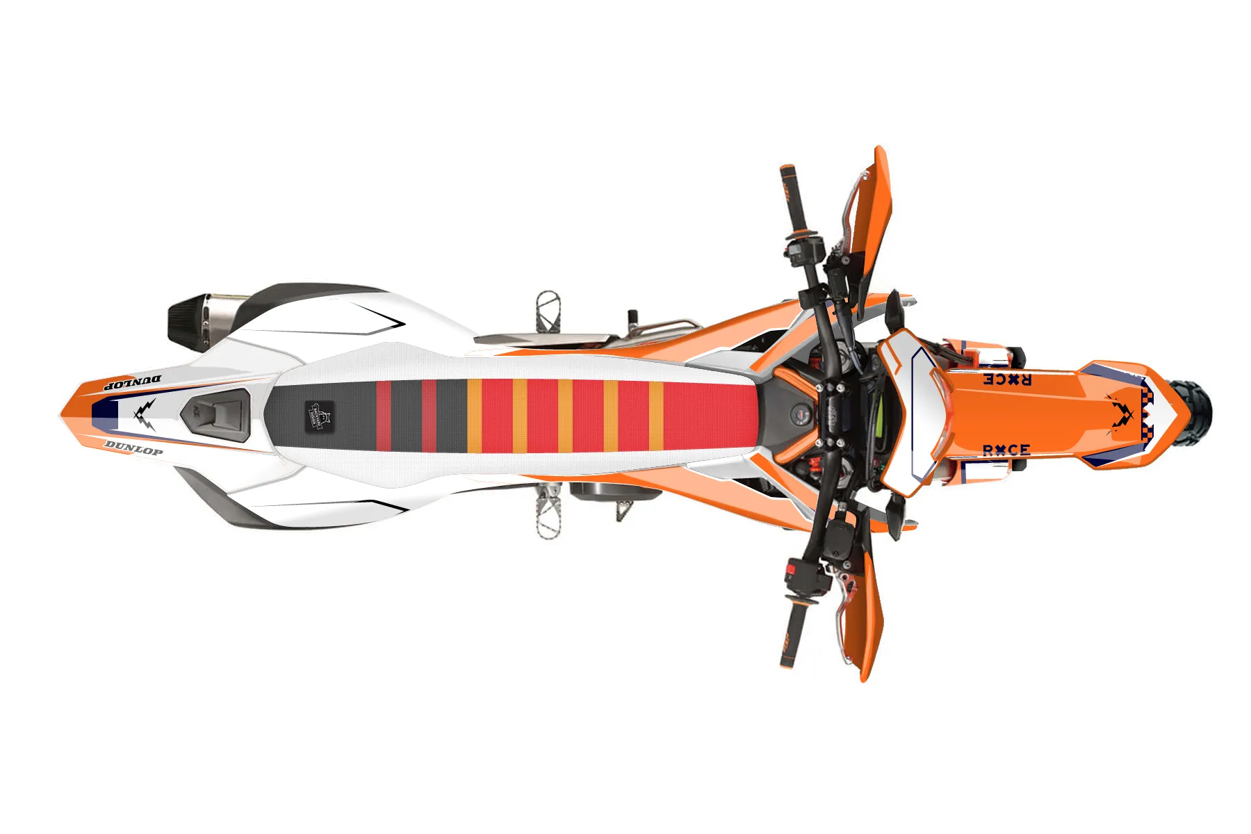 «Extreme» — готовый комплект графики серии Staple для KTM Enduro Graphic Kit KTM Enduro-R 690 2019. В комплекте: графика на бак и боковые облицовки, крылья (переднее и заднее), передний щиток, номерные таблички, защита вилки. Материал: ПВХ-винил 80 мкр с холодной ламинацией 300 мкр, общая толщина 380 мкр; покрытие глянцевое или матовое на выбор. Устойчив к UV-излучению, воде, бензину и мойке высокого давления. Клей акриловый на сольвентной основе — постоянный, для гибких пластиков. На простых поверхностях монтируется без нагрева; для сложных изгибов рекомендуем фен. Этот пресет можно заказать как есть или взять за основу в конструкторе: поменять цвета, добавить стартовый номер и свой бренд. Производство — 3–5 рабочих дней, доставка по России СДЭКом или Почтой, по СНГ — курьерскими службами.