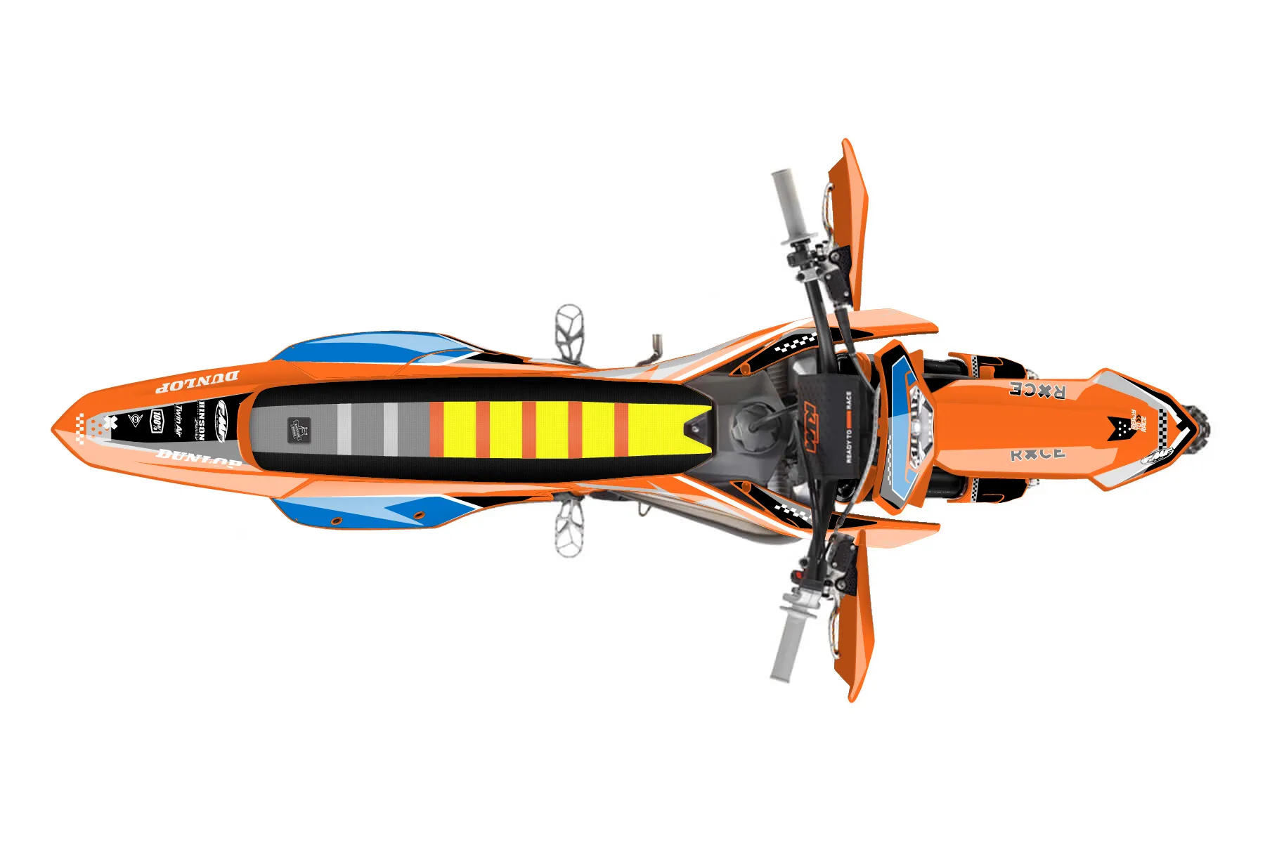 «Clean» — готовый комплект графики серии Staple для KTM Enduro Graphic Kit KTM EXC 125 2014. В комплекте: графика на бак и боковые облицовки, крылья (переднее и заднее), передний щиток, номерные таблички, защита вилки. Материал: ПВХ-винил 80 мкр с холодной ламинацией 300 мкр, общая толщина 380 мкр; покрытие глянцевое или матовое на выбор. Устойчив к UV-излучению, воде, бензину и мойке высокого давления. Клей акриловый на сольвентной основе — постоянный, для гибких пластиков. На простых поверхностях монтируется без нагрева; для сложных изгибов рекомендуем фен. Этот пресет можно заказать как есть или взять за основу в конструкторе: поменять цвета, добавить стартовый номер и свой бренд. Производство — 3–5 рабочих дней, доставка по России СДЭКом или Почтой, по СНГ — курьерскими службами.
