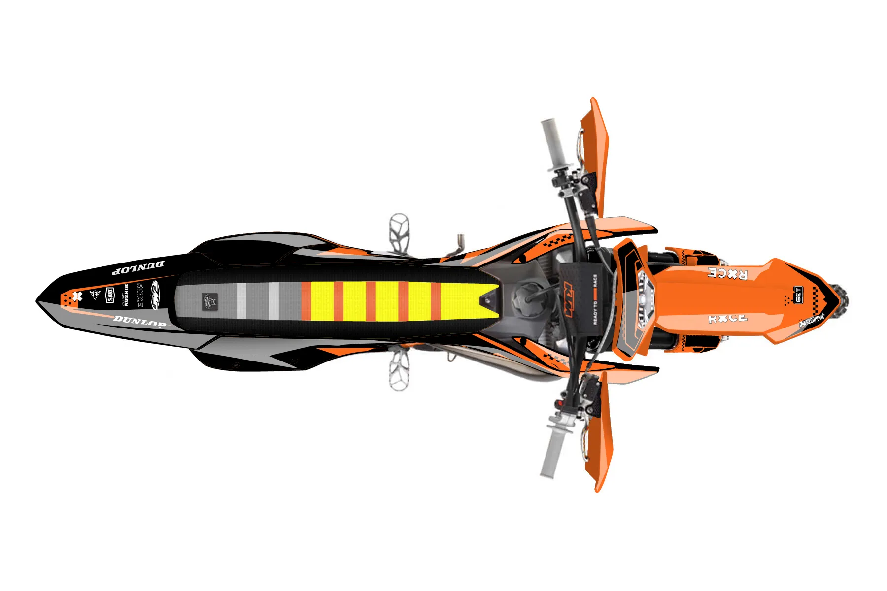 «Trait» — готовый комплект графики серии Staple для KTM Enduro Graphic Kit KTM EXC 125 2014. В комплекте: графика на бак и боковые облицовки, крылья (переднее и заднее), передний щиток, номерные таблички, защита вилки. Материал: ПВХ-винил 80 мкр с холодной ламинацией 300 мкр, общая толщина 380 мкр; покрытие глянцевое или матовое на выбор. Устойчив к UV-излучению, воде, бензину и мойке высокого давления. Клей акриловый на сольвентной основе — постоянный, для гибких пластиков. На простых поверхностях монтируется без нагрева; для сложных изгибов рекомендуем фен. Этот пресет можно заказать как есть или взять за основу в конструкторе: поменять цвета, добавить стартовый номер и свой бренд. Производство — 3–5 рабочих дней, доставка по России СДЭКом или Почтой, по СНГ — курьерскими службами.