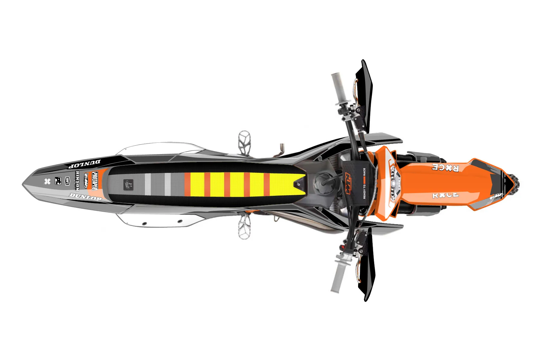 «Satisfied» — готовый комплект графики серии Untucked для KTM Enduro Graphic Kit KTM EXC 125 2014. В комплекте: графика на бак и боковые облицовки, крылья (переднее и заднее), передний щиток, номерные таблички, защита вилки. Материал: ПВХ-винил 80 мкр с холодной ламинацией 300 мкр, общая толщина 380 мкр; покрытие глянцевое или матовое на выбор. Устойчив к UV-излучению, воде, бензину и мойке высокого давления. Клей акриловый на сольвентной основе — постоянный, для гибких пластиков. На простых поверхностях монтируется без нагрева; для сложных изгибов рекомендуем фен. Этот пресет можно заказать как есть или взять за основу в конструкторе: поменять цвета, добавить стартовый номер и свой бренд. Производство — 3–5 рабочих дней, доставка по России СДЭКом или Почтой, по СНГ — курьерскими службами.