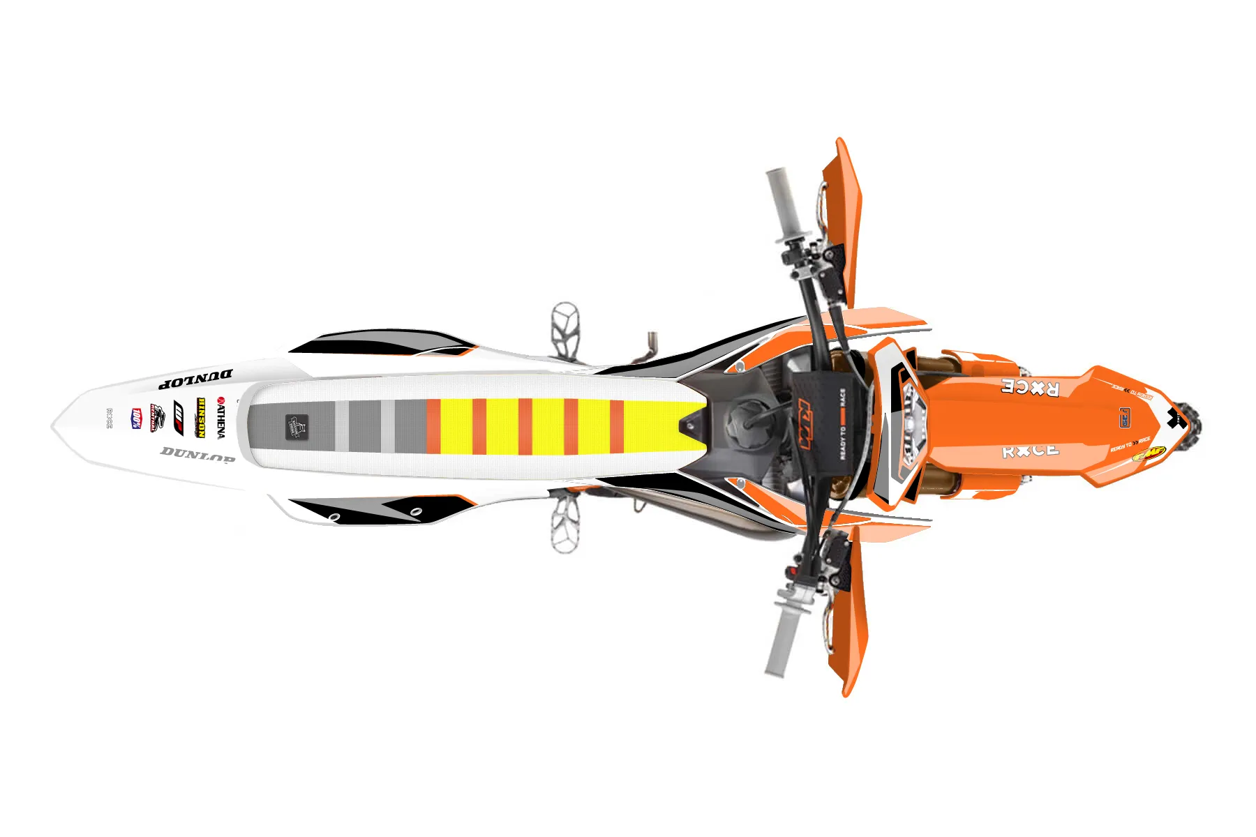 «Alpha» — готовый комплект графики серии Flow для KTM Enduro Graphic Kit KTM EXC 125 2016. В комплекте: графика на бак и боковые облицовки, крылья (переднее и заднее), передний щиток, номерные таблички, защита вилки. Материал: ПВХ-винил 80 мкр с холодной ламинацией 300 мкр, общая толщина 380 мкр; покрытие глянцевое или матовое на выбор. Устойчив к UV-излучению, воде, бензину и мойке высокого давления. Клей акриловый на сольвентной основе — постоянный, для гибких пластиков. На простых поверхностях монтируется без нагрева; для сложных изгибов рекомендуем фен. Этот пресет можно заказать как есть или взять за основу в конструкторе: поменять цвета, добавить стартовый номер и свой бренд. Производство — 3–5 рабочих дней, доставка по России СДЭКом или Почтой, по СНГ — курьерскими службами.