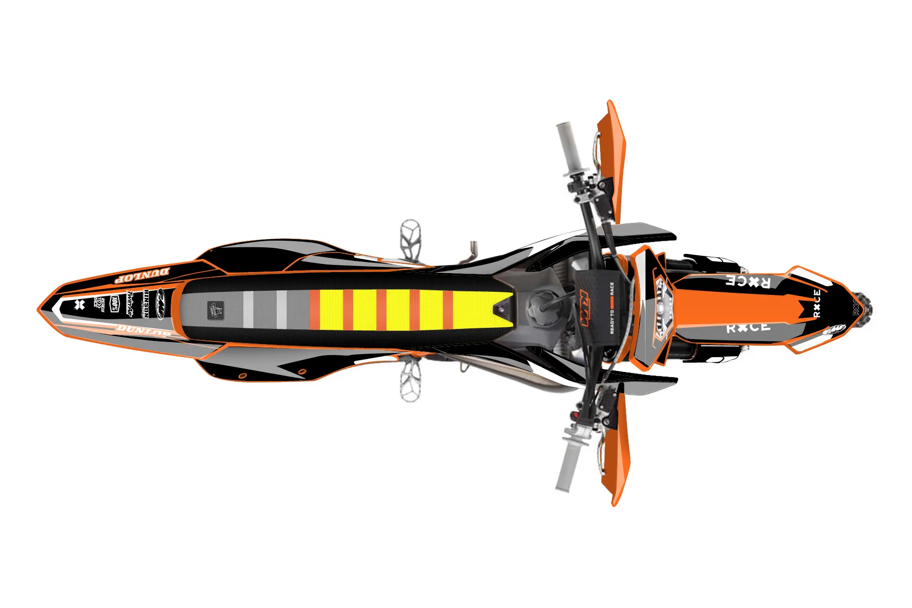 «Race» — готовый комплект графики серии Flow для KTM Enduro Graphic Kit KTM EXC 125 2016. В комплекте: графика на бак и боковые облицовки, крылья (переднее и заднее), передний щиток, номерные таблички, защита вилки. Материал: ПВХ-винил 80 мкр с холодной ламинацией 300 мкр, общая толщина 380 мкр; покрытие глянцевое или матовое на выбор. Устойчив к UV-излучению, воде, бензину и мойке высокого давления. Клей акриловый на сольвентной основе — постоянный, для гибких пластиков. На простых поверхностях монтируется без нагрева; для сложных изгибов рекомендуем фен. Этот пресет можно заказать как есть или взять за основу в конструкторе: поменять цвета, добавить стартовый номер и свой бренд. Производство — 3–5 рабочих дней, доставка по России СДЭКом или Почтой, по СНГ — курьерскими службами.