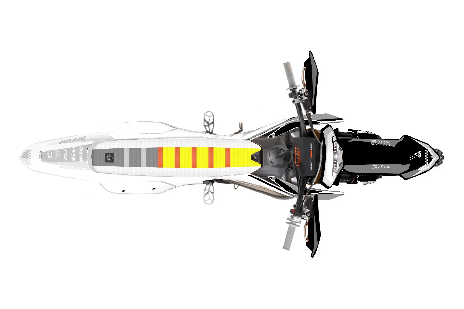 «Charge» — готовый комплект графики серии Staple для KTM Enduro Graphic Kit KTM EXC 125 2016. В комплекте: графика на бак и боковые облицовки, крылья (переднее и заднее), передний щиток, номерные таблички, защита вилки. Материал: ПВХ-винил 80 мкр с холодной ламинацией 300 мкр, общая толщина 380 мкр; покрытие глянцевое или матовое на выбор. Устойчив к UV-излучению, воде, бензину и мойке высокого давления. Клей акриловый на сольвентной основе — постоянный, для гибких пластиков. На простых поверхностях монтируется без нагрева; для сложных изгибов рекомендуем фен. Этот пресет можно заказать как есть или взять за основу в конструкторе: поменять цвета, добавить стартовый номер и свой бренд. Производство — 3–5 рабочих дней, доставка по России СДЭКом или Почтой, по СНГ — курьерскими службами.