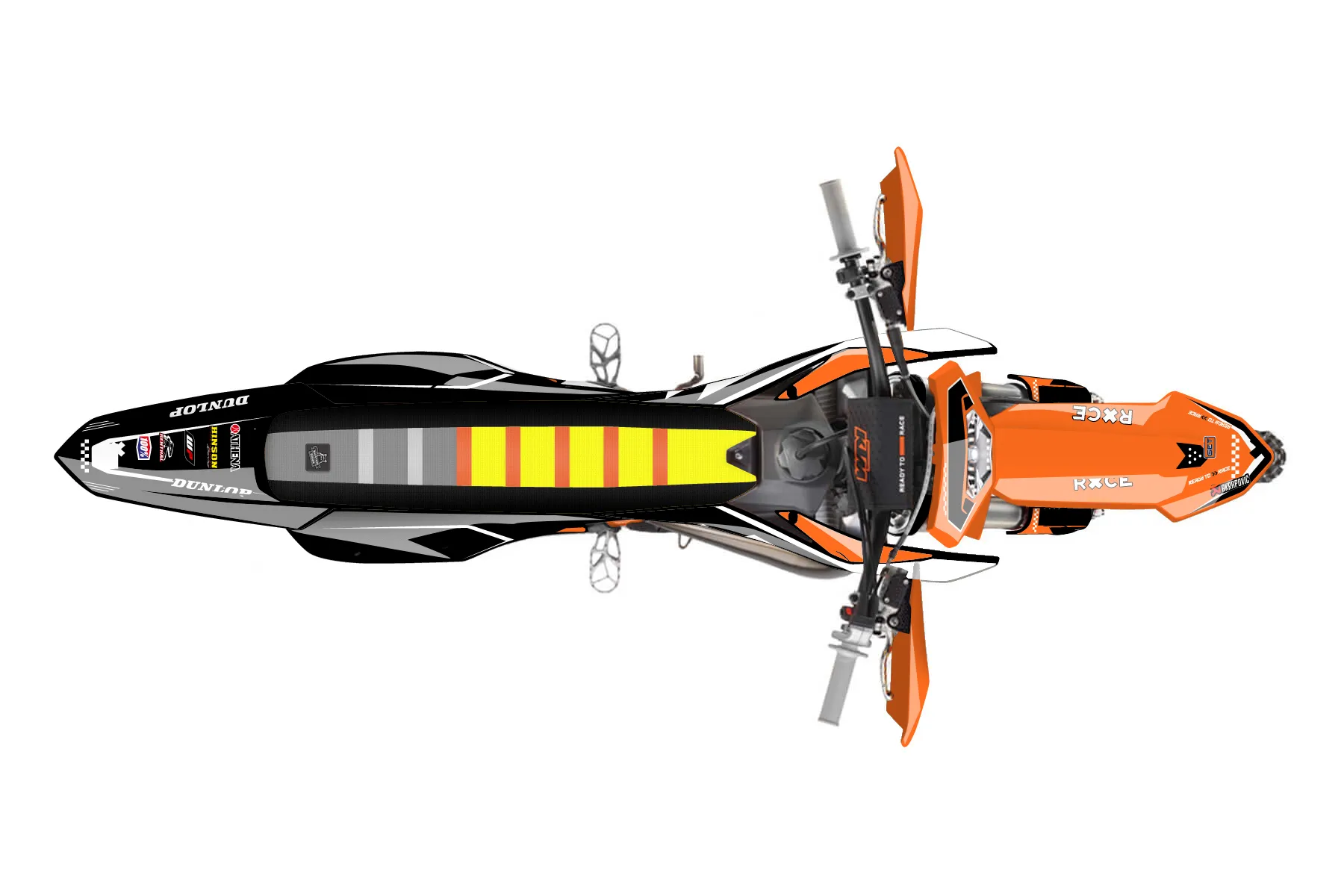 «Leak» — готовый комплект графики серии Staple для KTM Enduro Graphic Kit KTM EXC 125 2016. В комплекте: графика на бак и боковые облицовки, крылья (переднее и заднее), передний щиток, номерные таблички, защита вилки. Материал: ПВХ-винил 80 мкр с холодной ламинацией 300 мкр, общая толщина 380 мкр; покрытие глянцевое или матовое на выбор. Устойчив к UV-излучению, воде, бензину и мойке высокого давления. Клей акриловый на сольвентной основе — постоянный, для гибких пластиков. На простых поверхностях монтируется без нагрева; для сложных изгибов рекомендуем фен. Этот пресет можно заказать как есть или взять за основу в конструкторе: поменять цвета, добавить стартовый номер и свой бренд. Производство — 3–5 рабочих дней, доставка по России СДЭКом или Почтой, по СНГ — курьерскими службами.