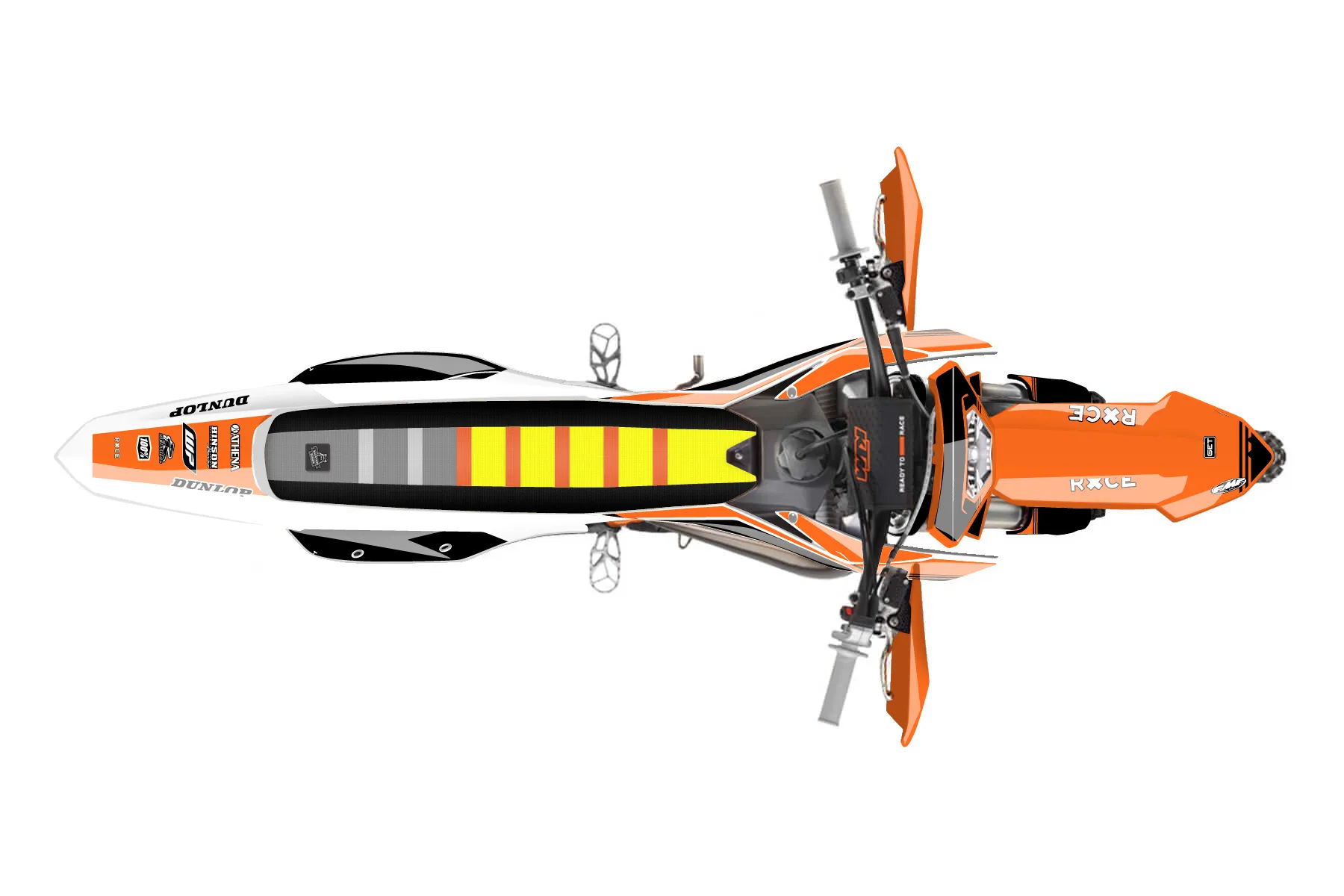 «Crowning» — готовый комплект графики серии Untucked для KTM Enduro Graphic Kit KTM EXC 125 2016. В комплекте: графика на бак и боковые облицовки, крылья (переднее и заднее), передний щиток, номерные таблички, защита вилки. Материал: ПВХ-винил 80 мкр с холодной ламинацией 300 мкр, общая толщина 380 мкр; покрытие глянцевое или матовое на выбор. Устойчив к UV-излучению, воде, бензину и мойке высокого давления. Клей акриловый на сольвентной основе — постоянный, для гибких пластиков. На простых поверхностях монтируется без нагрева; для сложных изгибов рекомендуем фен. Этот пресет можно заказать как есть или взять за основу в конструкторе: поменять цвета, добавить стартовый номер и свой бренд. Производство — 3–5 рабочих дней, доставка по России СДЭКом или Почтой, по СНГ — курьерскими службами.