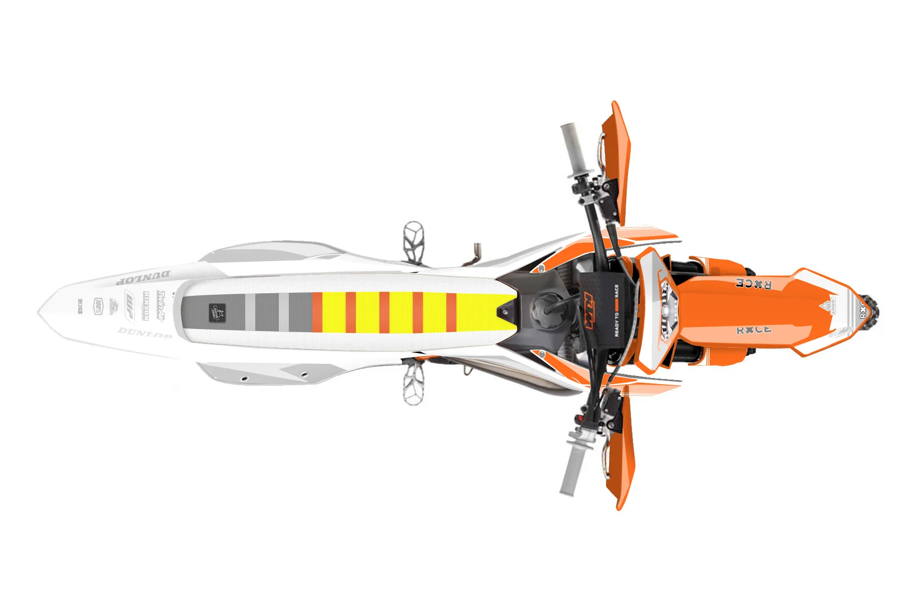 «Flying» — готовый комплект графики серии Untucked для KTM Enduro Graphic Kit KTM EXC 125 2016. В комплекте: графика на бак и боковые облицовки, крылья (переднее и заднее), передний щиток, номерные таблички, защита вилки. Материал: ПВХ-винил 80 мкр с холодной ламинацией 300 мкр, общая толщина 380 мкр; покрытие глянцевое или матовое на выбор. Устойчив к UV-излучению, воде, бензину и мойке высокого давления. Клей акриловый на сольвентной основе — постоянный, для гибких пластиков. На простых поверхностях монтируется без нагрева; для сложных изгибов рекомендуем фен. Этот пресет можно заказать как есть или взять за основу в конструкторе: поменять цвета, добавить стартовый номер и свой бренд. Производство — 3–5 рабочих дней, доставка по России СДЭКом или Почтой, по СНГ — курьерскими службами.