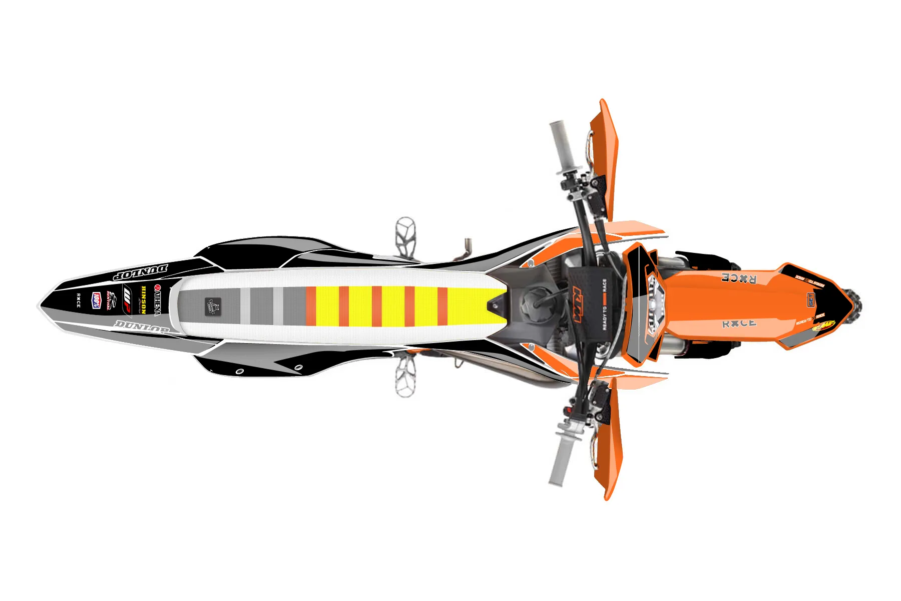 «Illusison» — готовый комплект графики серии Untucked для KTM Enduro Graphic Kit KTM EXC 125 2016. В комплекте: графика на бак и боковые облицовки, крылья (переднее и заднее), передний щиток, номерные таблички, защита вилки. Материал: ПВХ-винил 80 мкр с холодной ламинацией 300 мкр, общая толщина 380 мкр; покрытие глянцевое или матовое на выбор. Устойчив к UV-излучению, воде, бензину и мойке высокого давления. Клей акриловый на сольвентной основе — постоянный, для гибких пластиков. На простых поверхностях монтируется без нагрева; для сложных изгибов рекомендуем фен. Этот пресет можно заказать как есть или взять за основу в конструкторе: поменять цвета, добавить стартовый номер и свой бренд. Производство — 3–5 рабочих дней, доставка по России СДЭКом или Почтой, по СНГ — курьерскими службами.