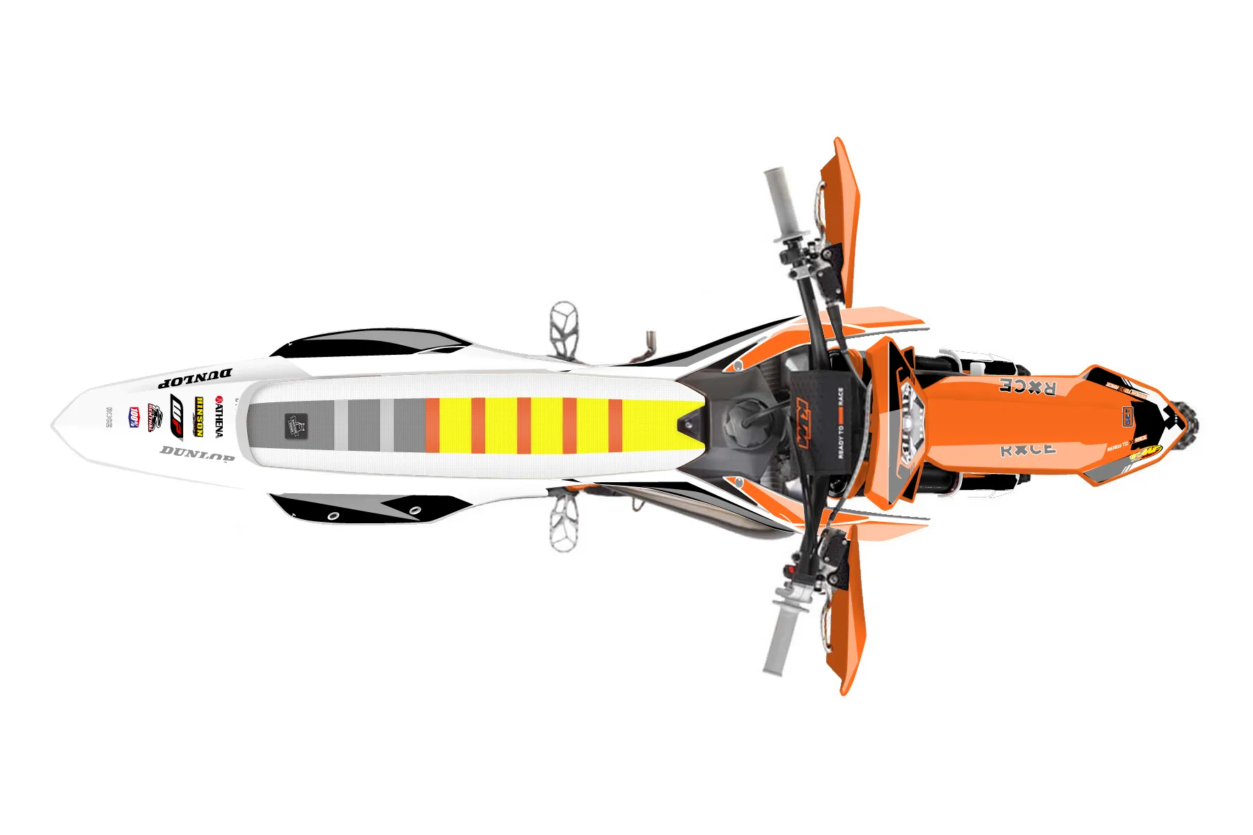 «Superb» — готовый комплект графики серии Untucked для KTM Enduro Graphic Kit KTM EXC 125 2016. В комплекте: графика на бак и боковые облицовки, крылья (переднее и заднее), передний щиток, номерные таблички, защита вилки. Материал: ПВХ-винил 80 мкр с холодной ламинацией 300 мкр, общая толщина 380 мкр; покрытие глянцевое или матовое на выбор. Устойчив к UV-излучению, воде, бензину и мойке высокого давления. Клей акриловый на сольвентной основе — постоянный, для гибких пластиков. На простых поверхностях монтируется без нагрева; для сложных изгибов рекомендуем фен. Этот пресет можно заказать как есть или взять за основу в конструкторе: поменять цвета, добавить стартовый номер и свой бренд. Производство — 3–5 рабочих дней, доставка по России СДЭКом или Почтой, по СНГ — курьерскими службами.