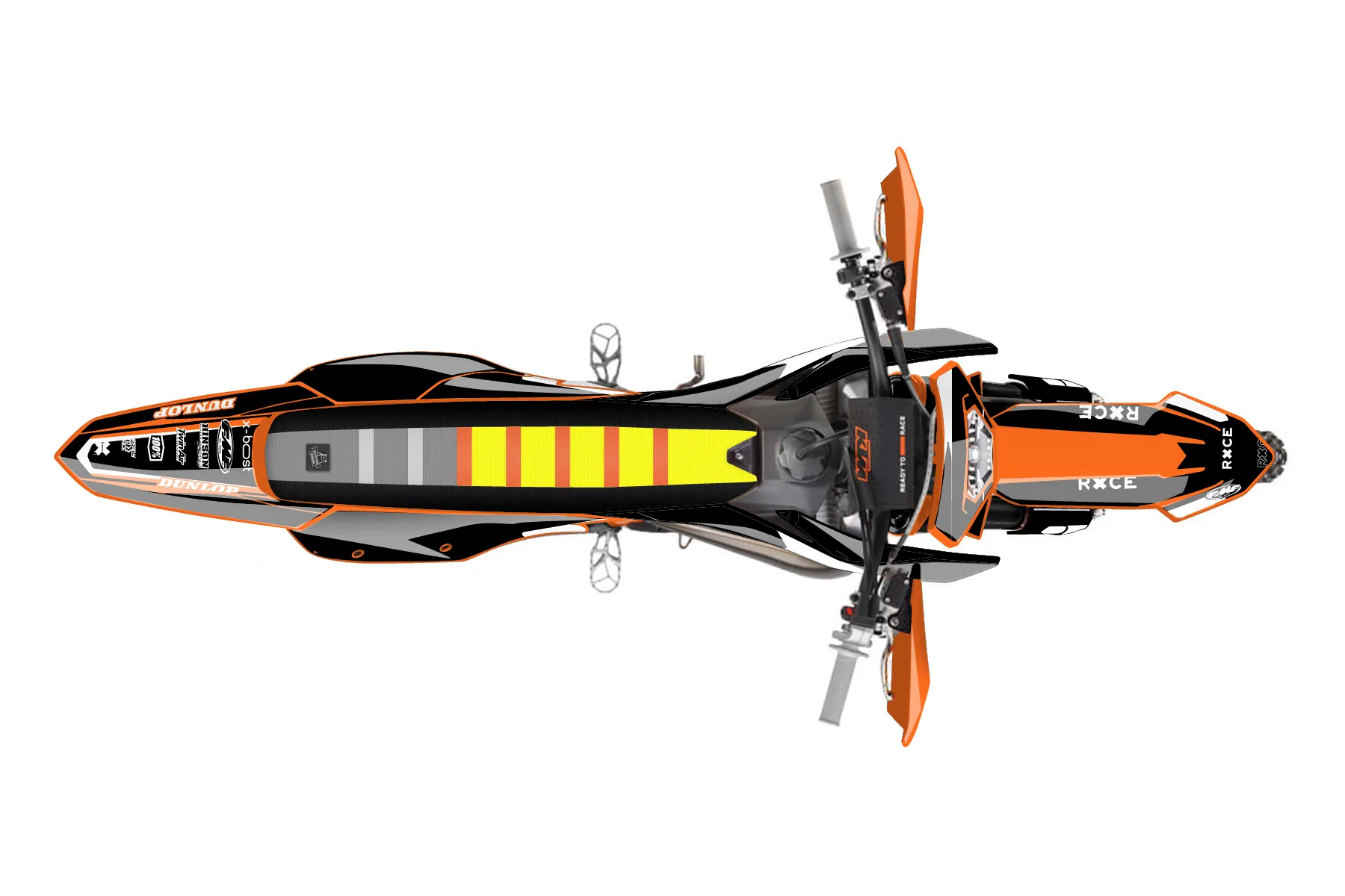 «Race» — готовый комплект графики серии Flow для KTM Enduro Graphic Kit KTM EXC 125 2017. В комплекте: графика на бак и боковые облицовки, крылья (переднее и заднее), передний щиток, номерные таблички, защита вилки. Материал: ПВХ-винил 80 мкр с холодной ламинацией 300 мкр, общая толщина 380 мкр; покрытие глянцевое или матовое на выбор. Устойчив к UV-излучению, воде, бензину и мойке высокого давления. Клей акриловый на сольвентной основе — постоянный, для гибких пластиков. На простых поверхностях монтируется без нагрева; для сложных изгибов рекомендуем фен. Этот пресет можно заказать как есть или взять за основу в конструкторе: поменять цвета, добавить стартовый номер и свой бренд. Производство — 3–5 рабочих дней, доставка по России СДЭКом или Почтой, по СНГ — курьерскими службами.