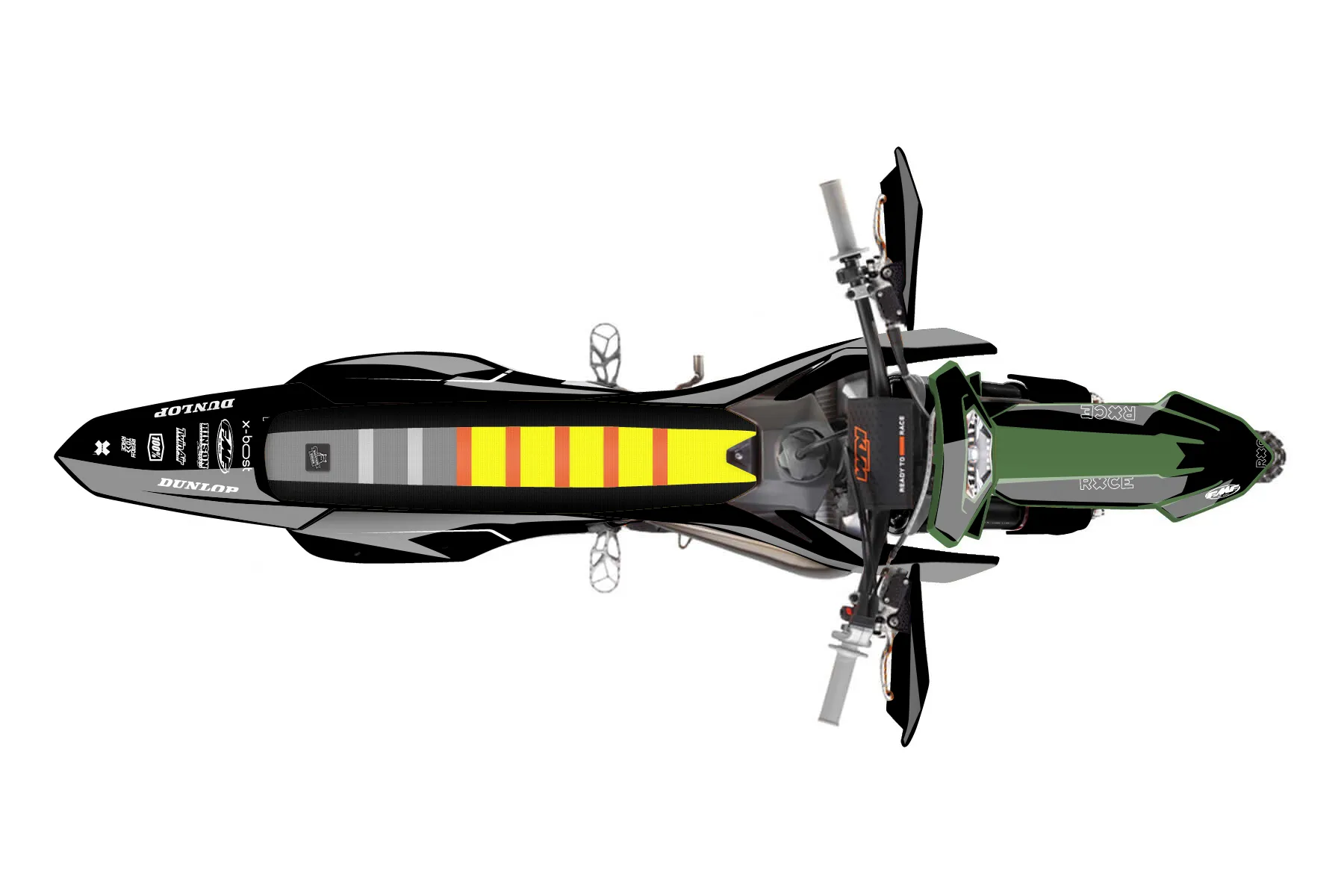 «Thrive» — готовый комплект графики серии Flow для KTM Enduro Graphic Kit KTM EXC 125 2017. В комплекте: графика на бак и боковые облицовки, крылья (переднее и заднее), передний щиток, номерные таблички, защита вилки. Материал: ПВХ-винил 80 мкр с холодной ламинацией 300 мкр, общая толщина 380 мкр; покрытие глянцевое или матовое на выбор. Устойчив к UV-излучению, воде, бензину и мойке высокого давления. Клей акриловый на сольвентной основе — постоянный, для гибких пластиков. На простых поверхностях монтируется без нагрева; для сложных изгибов рекомендуем фен. Этот пресет можно заказать как есть или взять за основу в конструкторе: поменять цвета, добавить стартовый номер и свой бренд. Производство — 3–5 рабочих дней, доставка по России СДЭКом или Почтой, по СНГ — курьерскими службами.