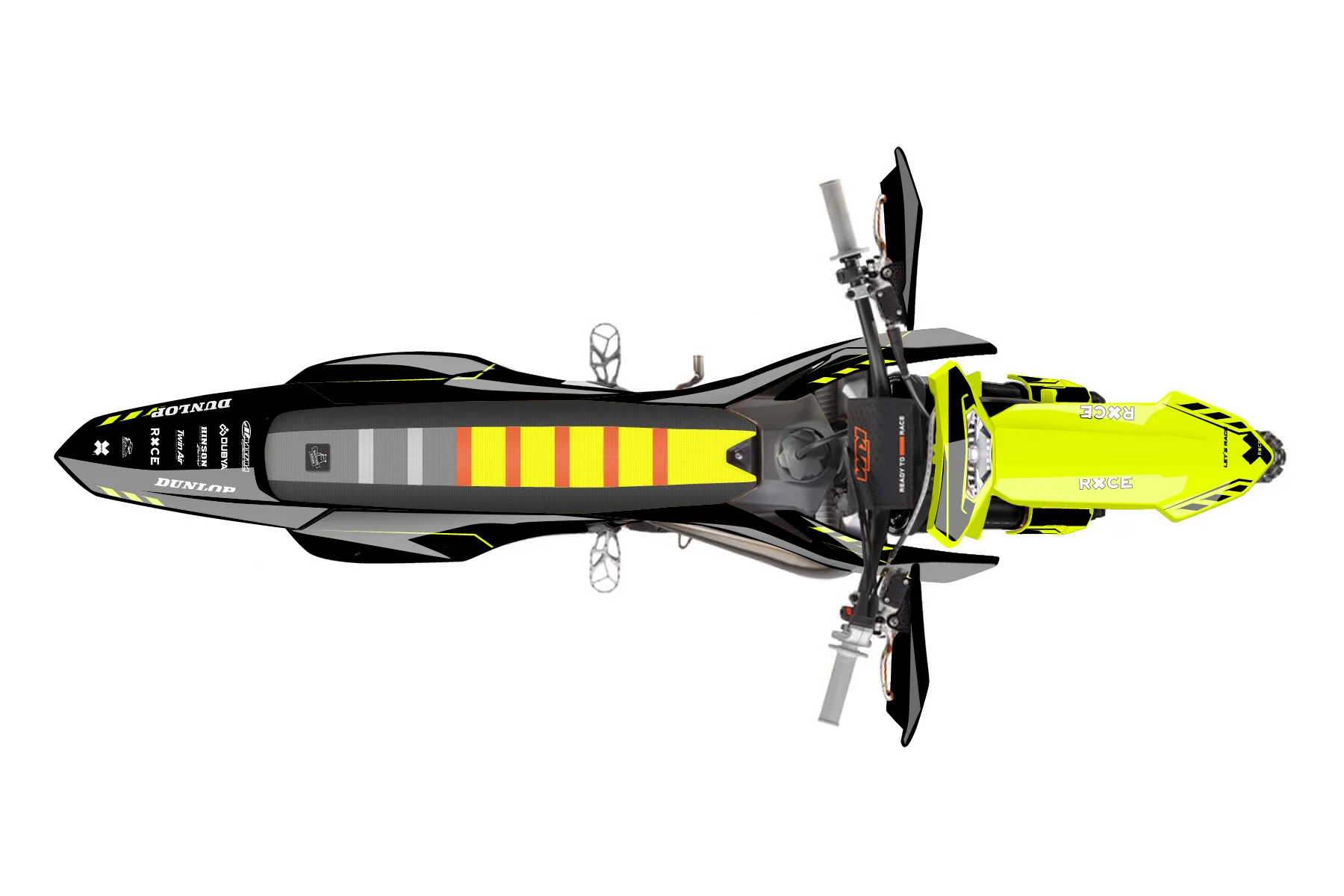 «Kitted Neon» — готовый комплект графики серии Maverick для KTM Enduro Graphic Kit KTM EXC 125 2017. В комплекте: графика на бак и боковые облицовки, крылья (переднее и заднее), передний щиток, номерные таблички, защита вилки. Материал: ПВХ-винил 80 мкр с холодной ламинацией 300 мкр, общая толщина 380 мкр; покрытие глянцевое или матовое на выбор. Устойчив к UV-излучению, воде, бензину и мойке высокого давления. Клей акриловый на сольвентной основе — постоянный, для гибких пластиков. На простых поверхностях монтируется без нагрева; для сложных изгибов рекомендуем фен. Этот пресет можно заказать как есть или взять за основу в конструкторе: поменять цвета, добавить стартовый номер и свой бренд. Производство — 3–5 рабочих дней, доставка по России СДЭКом или Почтой, по СНГ — курьерскими службами.