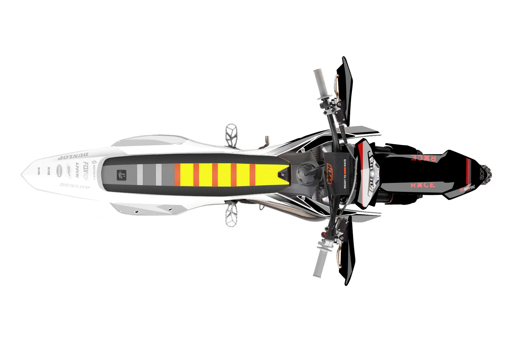«Rise» — готовый комплект графики серии Maverick для KTM Enduro Graphic Kit KTM EXC 125 2017. В комплекте: графика на бак и боковые облицовки, крылья (переднее и заднее), передний щиток, номерные таблички, защита вилки. Материал: ПВХ-винил 80 мкр с холодной ламинацией 300 мкр, общая толщина 380 мкр; покрытие глянцевое или матовое на выбор. Устойчив к UV-излучению, воде, бензину и мойке высокого давления. Клей акриловый на сольвентной основе — постоянный, для гибких пластиков. На простых поверхностях монтируется без нагрева; для сложных изгибов рекомендуем фен. Этот пресет можно заказать как есть или взять за основу в конструкторе: поменять цвета, добавить стартовый номер и свой бренд. Производство — 3–5 рабочих дней, доставка по России СДЭКом или Почтой, по СНГ — курьерскими службами.