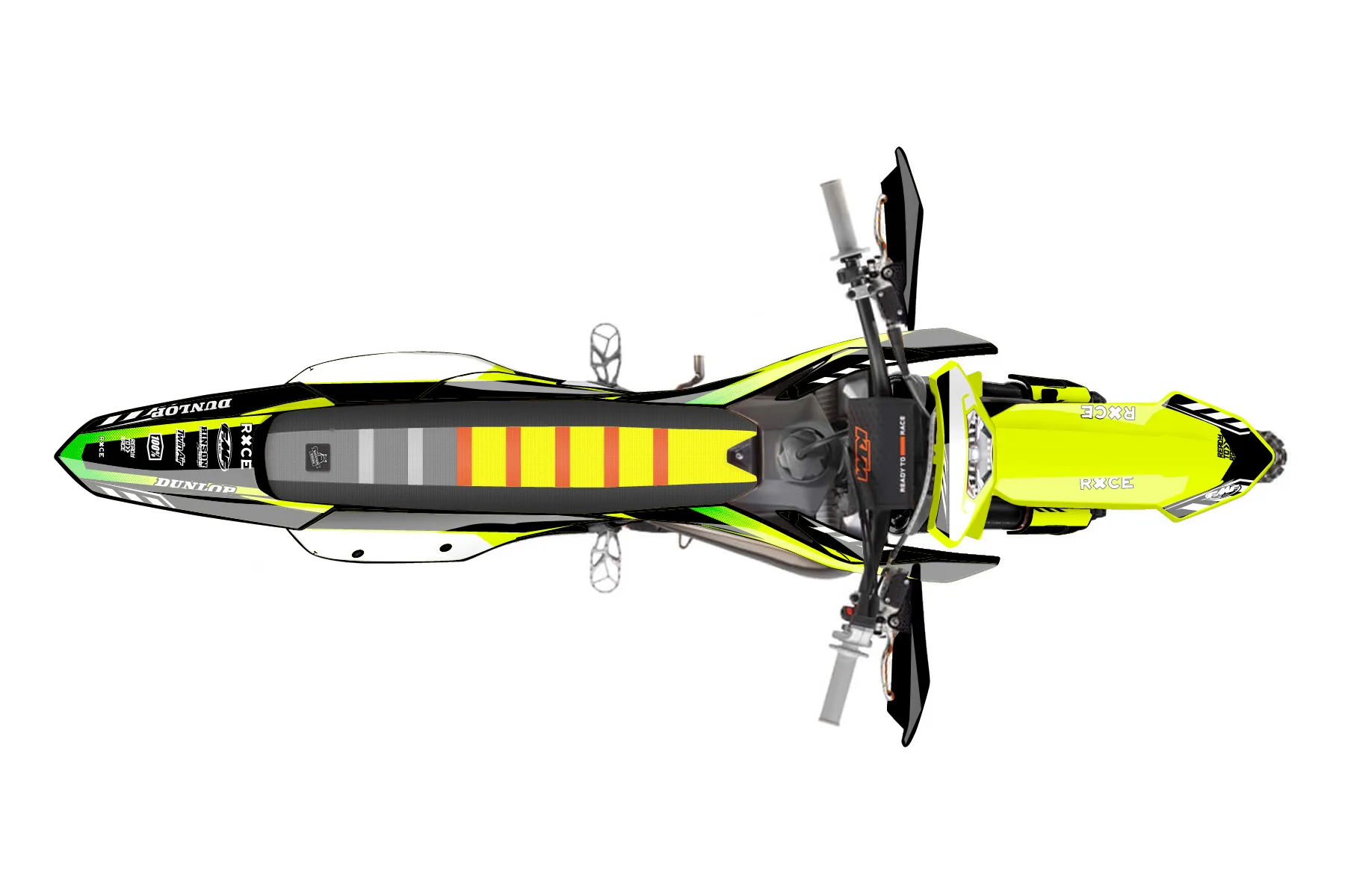 «Volt Neon» — готовый комплект графики серии Maverick для KTM Enduro Graphic Kit KTM EXC 125 2017. В комплекте: графика на бак и боковые облицовки, крылья (переднее и заднее), передний щиток, номерные таблички, защита вилки. Материал: ПВХ-винил 80 мкр с холодной ламинацией 300 мкр, общая толщина 380 мкр; покрытие глянцевое или матовое на выбор. Устойчив к UV-излучению, воде, бензину и мойке высокого давления. Клей акриловый на сольвентной основе — постоянный, для гибких пластиков. На простых поверхностях монтируется без нагрева; для сложных изгибов рекомендуем фен. Этот пресет можно заказать как есть или взять за основу в конструкторе: поменять цвета, добавить стартовый номер и свой бренд. Производство — 3–5 рабочих дней, доставка по России СДЭКом или Почтой, по СНГ — курьерскими службами.
