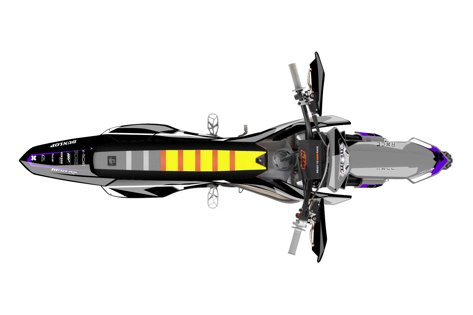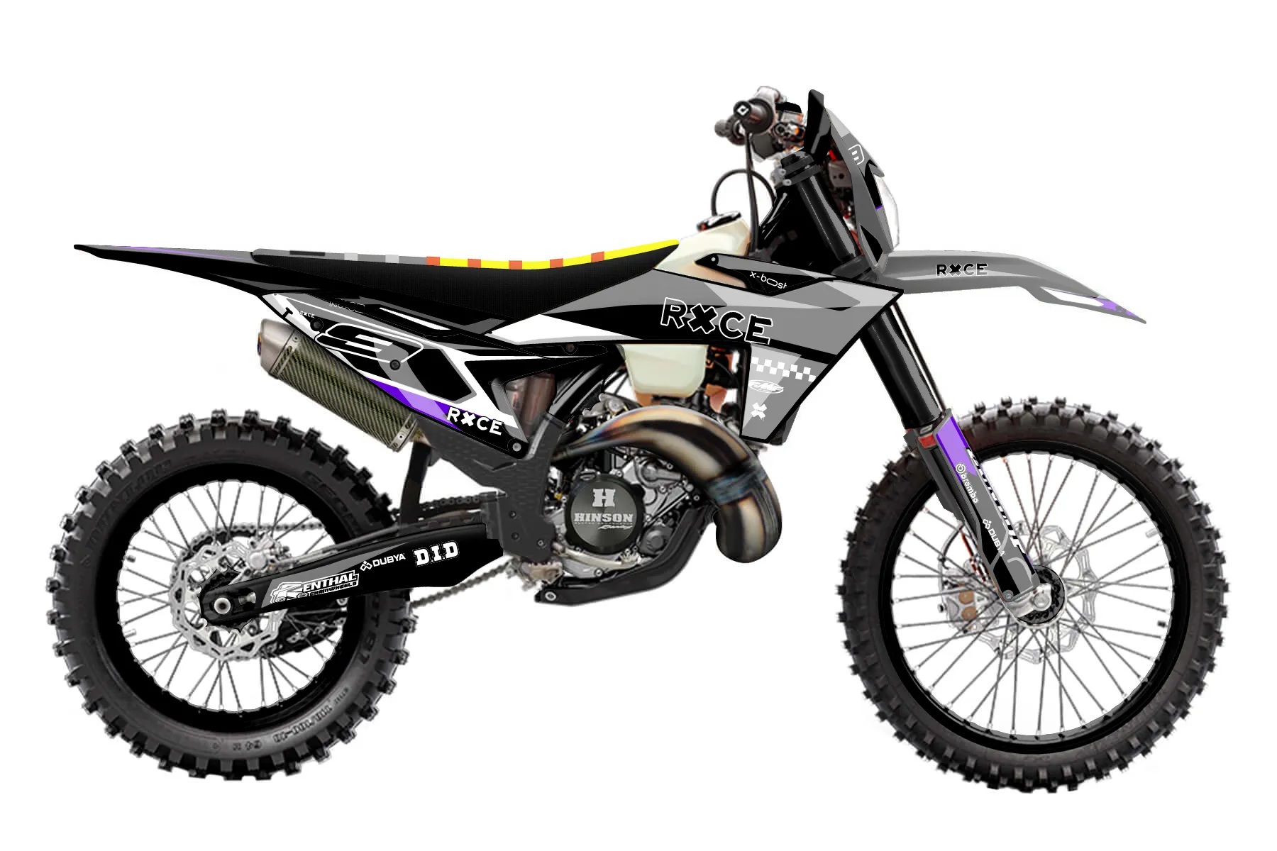«Cyber Pirate» — готовый комплект графики серии Flow для KTM Enduro Graphic Kit KTM EXC 125 2020. В комплекте: графика на бак и боковые облицовки, крылья (переднее и заднее), передний щиток, номерные таблички, защита вилки. Материал: ПВХ-винил 80 мкр с холодной ламинацией 300 мкр, общая толщина 380 мкр; покрытие глянцевое или матовое на выбор. Устойчив к UV-излучению, воде, бензину и мойке высокого давления. Клей акриловый на сольвентной основе — постоянный, для гибких пластиков. На простых поверхностях монтируется без нагрева; для сложных изгибов рекомендуем фен. Этот пресет можно заказать как есть или взять за основу в конструкторе: поменять цвета, добавить стартовый номер и свой бренд. Производство — 3–5 рабочих дней, доставка по России СДЭКом или Почтой, по СНГ — курьерскими службами.
