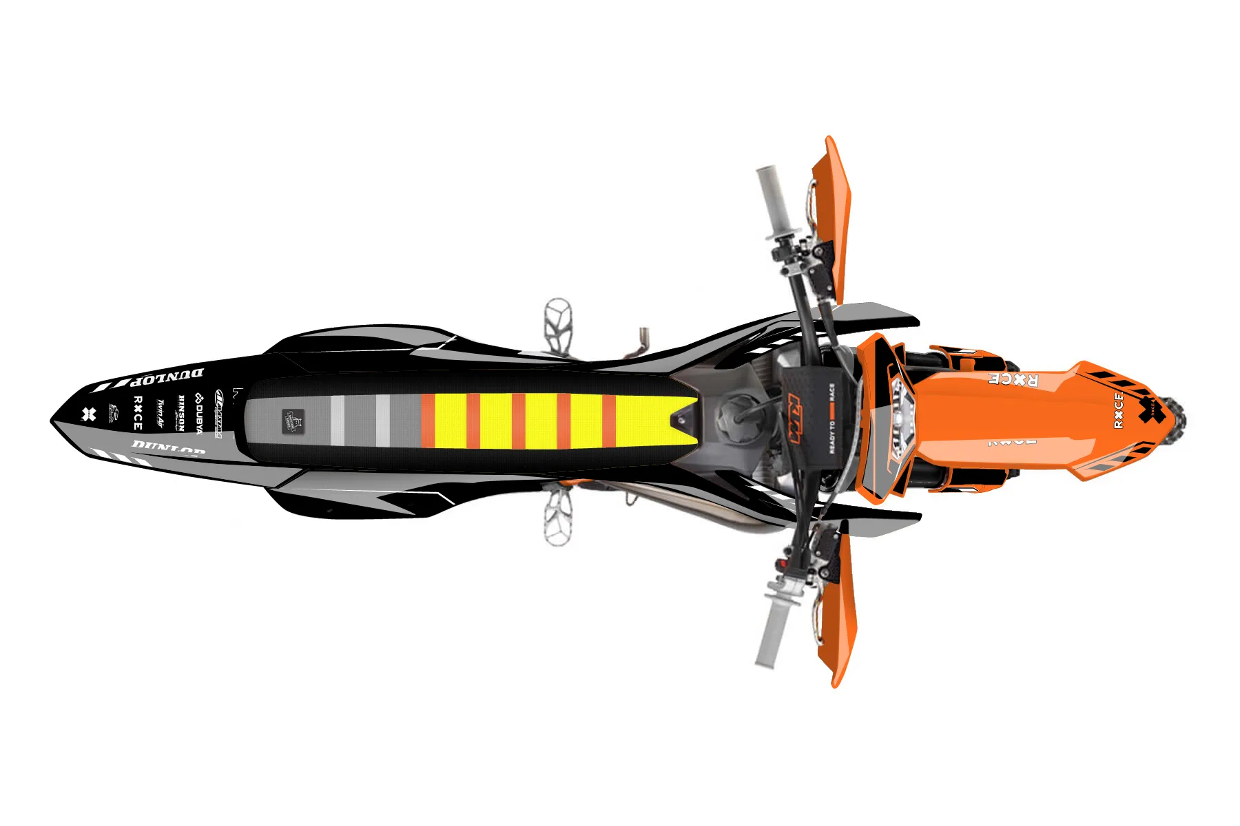 «Daze» — готовый комплект графики серии Maverick для KTM Enduro Graphic Kit KTM EXC 125 2020. В комплекте: графика на бак и боковые облицовки, крылья (переднее и заднее), передний щиток, номерные таблички, защита вилки. Материал: ПВХ-винил 80 мкр с холодной ламинацией 300 мкр, общая толщина 380 мкр; покрытие глянцевое или матовое на выбор. Устойчив к UV-излучению, воде, бензину и мойке высокого давления. Клей акриловый на сольвентной основе — постоянный, для гибких пластиков. На простых поверхностях монтируется без нагрева; для сложных изгибов рекомендуем фен. Этот пресет можно заказать как есть или взять за основу в конструкторе: поменять цвета, добавить стартовый номер и свой бренд. Производство — 3–5 рабочих дней, доставка по России СДЭКом или Почтой, по СНГ — курьерскими службами.