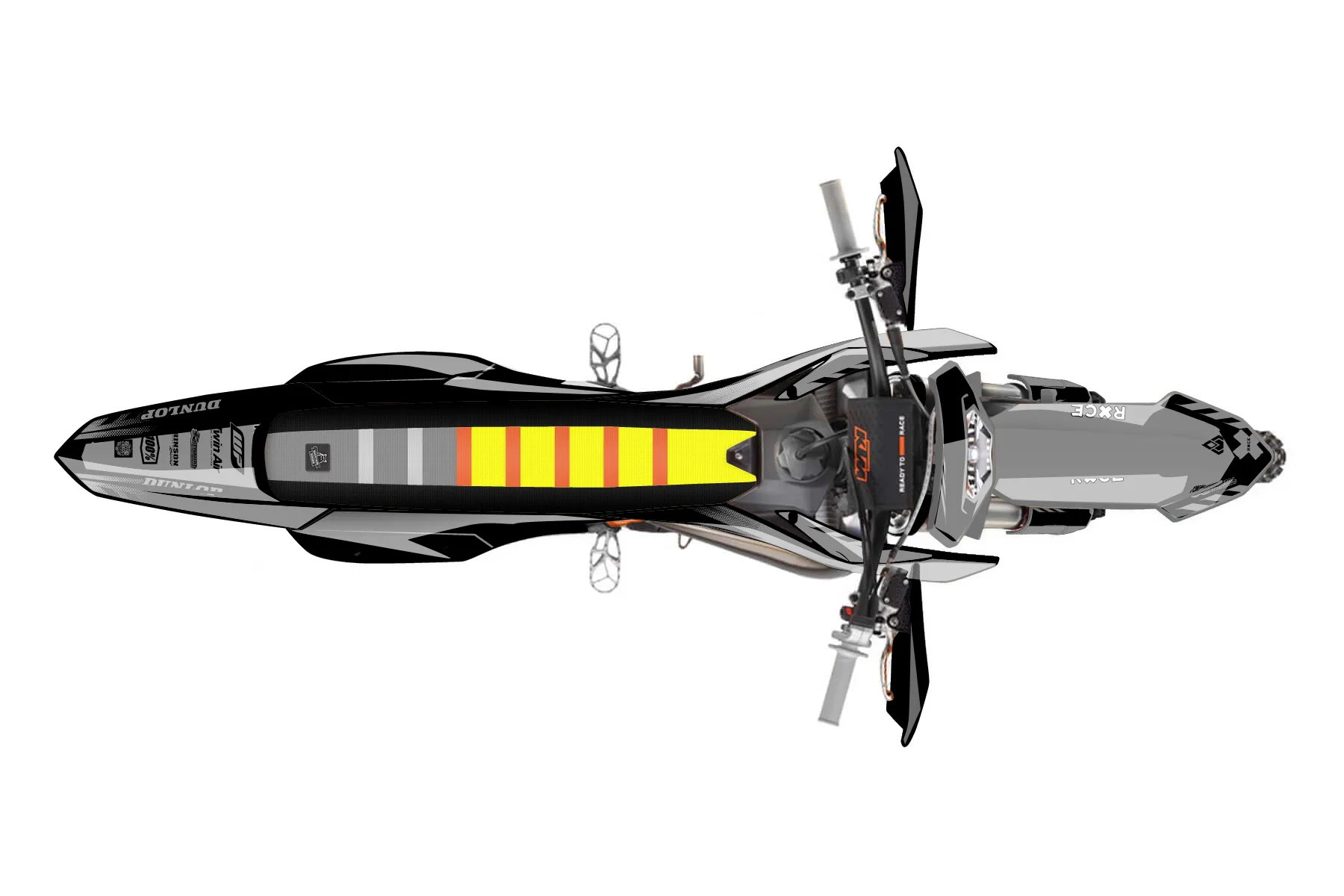 «Grip» — готовый комплект графики серии Maverick для KTM Enduro Graphic Kit KTM EXC 125 2020. В комплекте: графика на бак и боковые облицовки, крылья (переднее и заднее), передний щиток, номерные таблички, защита вилки. Материал: ПВХ-винил 80 мкр с холодной ламинацией 300 мкр, общая толщина 380 мкр; покрытие глянцевое или матовое на выбор. Устойчив к UV-излучению, воде, бензину и мойке высокого давления. Клей акриловый на сольвентной основе — постоянный, для гибких пластиков. На простых поверхностях монтируется без нагрева; для сложных изгибов рекомендуем фен. Этот пресет можно заказать как есть или взять за основу в конструкторе: поменять цвета, добавить стартовый номер и свой бренд. Производство — 3–5 рабочих дней, доставка по России СДЭКом или Почтой, по СНГ — курьерскими службами.