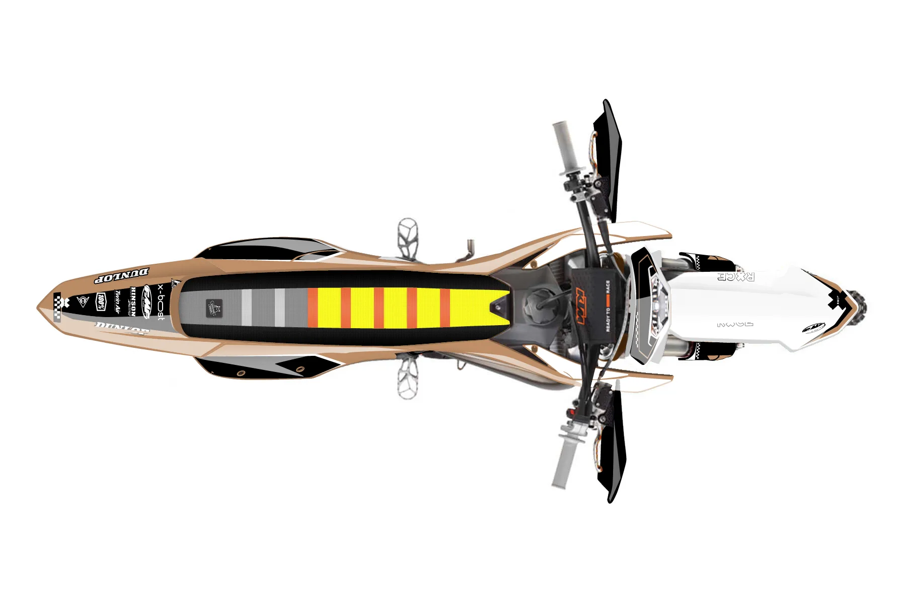 «Polite» — готовый комплект графики серии Staple для KTM Enduro Graphic Kit KTM EXC 125 2020. В комплекте: графика на бак и боковые облицовки, крылья (переднее и заднее), передний щиток, номерные таблички, защита вилки. Материал: ПВХ-винил 80 мкр с холодной ламинацией 300 мкр, общая толщина 380 мкр; покрытие глянцевое или матовое на выбор. Устойчив к UV-излучению, воде, бензину и мойке высокого давления. Клей акриловый на сольвентной основе — постоянный, для гибких пластиков. На простых поверхностях монтируется без нагрева; для сложных изгибов рекомендуем фен. Этот пресет можно заказать как есть или взять за основу в конструкторе: поменять цвета, добавить стартовый номер и свой бренд. Производство — 3–5 рабочих дней, доставка по России СДЭКом или Почтой, по СНГ — курьерскими службами.