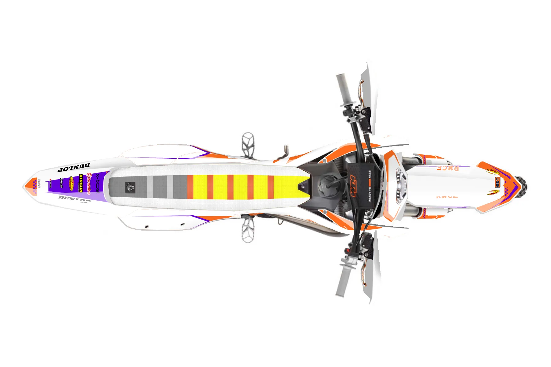 «Retro» — готовый комплект графики серии Staple для KTM Enduro Graphic Kit KTM EXC 125 2020. В комплекте: графика на бак и боковые облицовки, крылья (переднее и заднее), передний щиток, номерные таблички, защита вилки. Материал: ПВХ-винил 80 мкр с холодной ламинацией 300 мкр, общая толщина 380 мкр; покрытие глянцевое или матовое на выбор. Устойчив к UV-излучению, воде, бензину и мойке высокого давления. Клей акриловый на сольвентной основе — постоянный, для гибких пластиков. На простых поверхностях монтируется без нагрева; для сложных изгибов рекомендуем фен. Этот пресет можно заказать как есть или взять за основу в конструкторе: поменять цвета, добавить стартовый номер и свой бренд. Производство — 3–5 рабочих дней, доставка по России СДЭКом или Почтой, по СНГ — курьерскими службами.