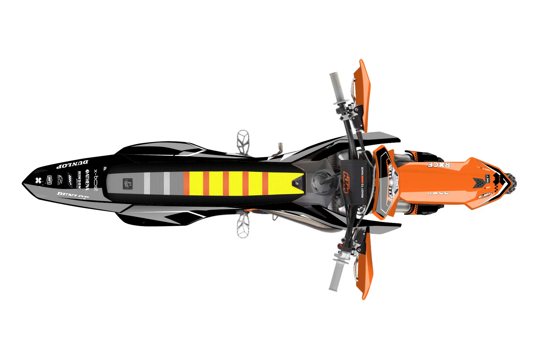 «Thrill» — готовый комплект графики серии Staple для KTM Enduro Graphic Kit KTM EXC 125 2020. В комплекте: графика на бак и боковые облицовки, крылья (переднее и заднее), передний щиток, номерные таблички, защита вилки. Материал: ПВХ-винил 80 мкр с холодной ламинацией 300 мкр, общая толщина 380 мкр; покрытие глянцевое или матовое на выбор. Устойчив к UV-излучению, воде, бензину и мойке высокого давления. Клей акриловый на сольвентной основе — постоянный, для гибких пластиков. На простых поверхностях монтируется без нагрева; для сложных изгибов рекомендуем фен. Этот пресет можно заказать как есть или взять за основу в конструкторе: поменять цвета, добавить стартовый номер и свой бренд. Производство — 3–5 рабочих дней, доставка по России СДЭКом или Почтой, по СНГ — курьерскими службами.