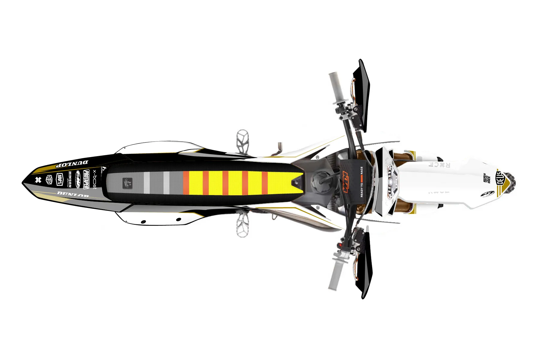 «Sharp» — готовый комплект графики серии Untucked для KTM Enduro Graphic Kit KTM EXC 125 2020. В комплекте: графика на бак и боковые облицовки, крылья (переднее и заднее), передний щиток, номерные таблички, защита вилки. Материал: ПВХ-винил 80 мкр с холодной ламинацией 300 мкр, общая толщина 380 мкр; покрытие глянцевое или матовое на выбор. Устойчив к UV-излучению, воде, бензину и мойке высокого давления. Клей акриловый на сольвентной основе — постоянный, для гибких пластиков. На простых поверхностях монтируется без нагрева; для сложных изгибов рекомендуем фен. Этот пресет можно заказать как есть или взять за основу в конструкторе: поменять цвета, добавить стартовый номер и свой бренд. Производство — 3–5 рабочих дней, доставка по России СДЭКом или Почтой, по СНГ — курьерскими службами.