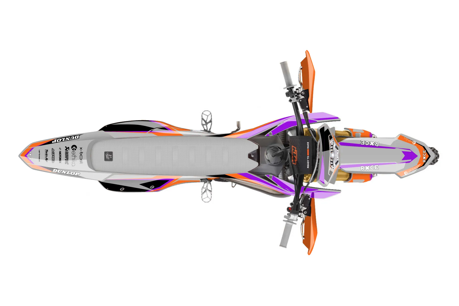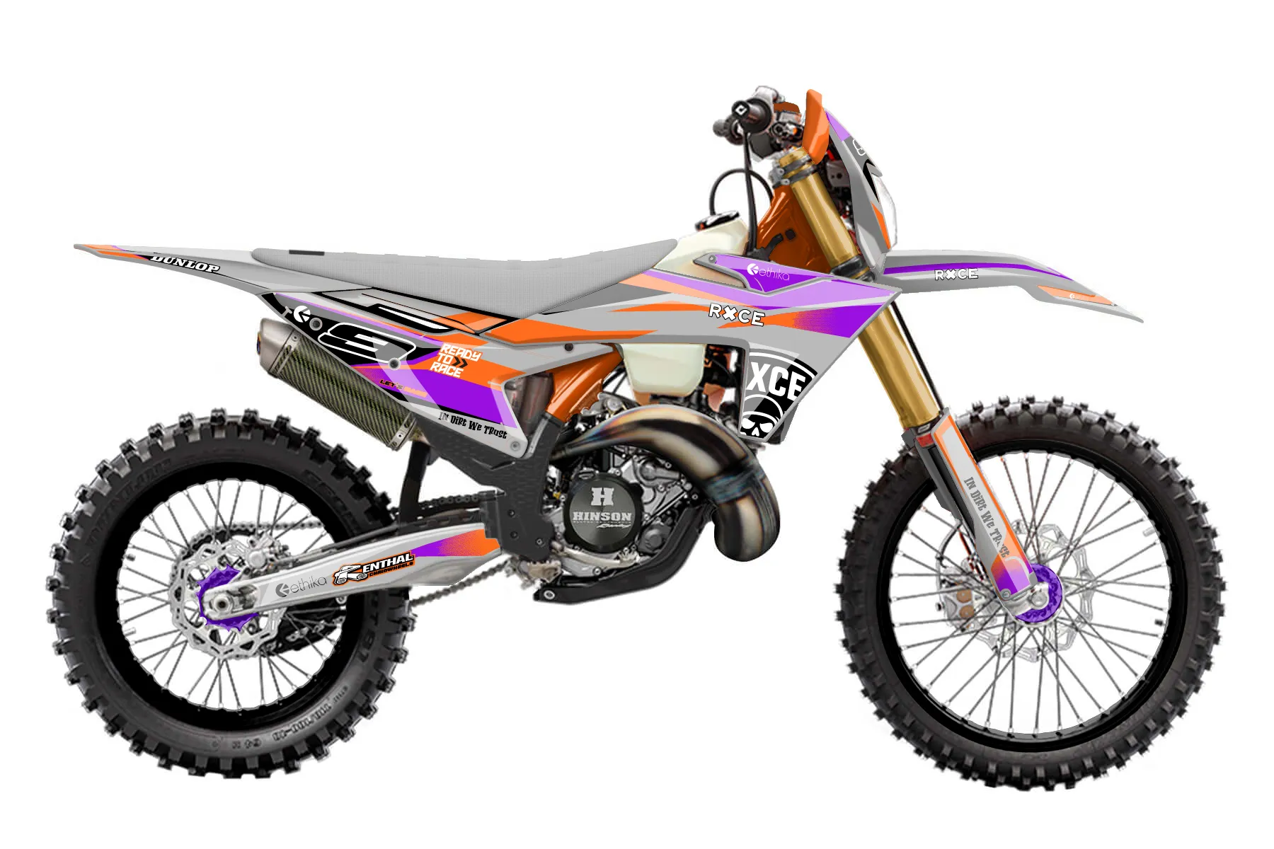 «Emphatic» — готовый комплект графики серии Fusion для KTM Enduro Graphic Kit KTM EXC 125 2024. В комплекте: графика на бак и боковые облицовки, крылья (переднее и заднее), передний щиток, номерные таблички, защита вилки. Материал: ПВХ-винил 80 мкр с холодной ламинацией 300 мкр, общая толщина 380 мкр; покрытие глянцевое или матовое на выбор. Устойчив к UV-излучению, воде, бензину и мойке высокого давления. Клей акриловый на сольвентной основе — постоянный, для гибких пластиков. На простых поверхностях монтируется без нагрева; для сложных изгибов рекомендуем фен. Этот пресет можно заказать как есть или взять за основу в конструкторе: поменять цвета, добавить стартовый номер и свой бренд. Производство — 3–5 рабочих дней, доставка по России СДЭКом или Почтой, по СНГ — курьерскими службами.