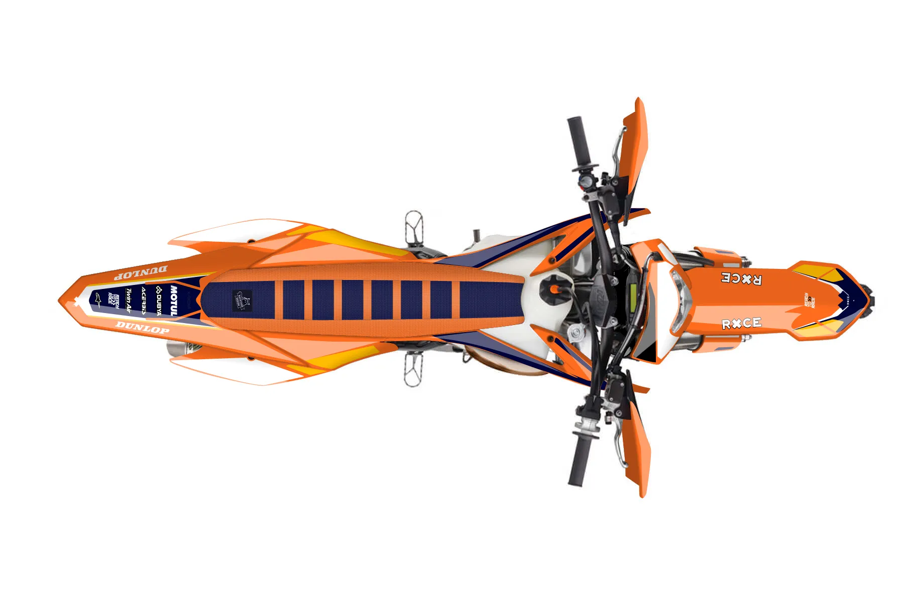 «Pixel» — готовый комплект графики серии Flow для KTM Enduro Graphic Kit KTM EXC 150 2014. В комплекте: графика на бак и боковые облицовки, крылья (переднее и заднее), передний щиток, номерные таблички, защита вилки. Материал: ПВХ-винил 80 мкр с холодной ламинацией 300 мкр, общая толщина 380 мкр; покрытие глянцевое или матовое на выбор. Устойчив к UV-излучению, воде, бензину и мойке высокого давления. Клей акриловый на сольвентной основе — постоянный, для гибких пластиков. На простых поверхностях монтируется без нагрева; для сложных изгибов рекомендуем фен. Этот пресет можно заказать как есть или взять за основу в конструкторе: поменять цвета, добавить стартовый номер и свой бренд. Производство — 3–5 рабочих дней, доставка по России СДЭКом или Почтой, по СНГ — курьерскими службами.