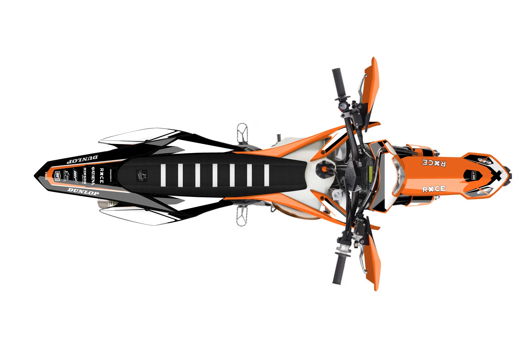 «Spotlight» — готовый комплект графики серии Flow для KTM Enduro Graphic Kit KTM EXC 150 2014. В комплекте: графика на бак и боковые облицовки, крылья (переднее и заднее), передний щиток, номерные таблички, защита вилки. Материал: ПВХ-винил 80 мкр с холодной ламинацией 300 мкр, общая толщина 380 мкр; покрытие глянцевое или матовое на выбор. Устойчив к UV-излучению, воде, бензину и мойке высокого давления. Клей акриловый на сольвентной основе — постоянный, для гибких пластиков. На простых поверхностях монтируется без нагрева; для сложных изгибов рекомендуем фен. Этот пресет можно заказать как есть или взять за основу в конструкторе: поменять цвета, добавить стартовый номер и свой бренд. Производство — 3–5 рабочих дней, доставка по России СДЭКом или Почтой, по СНГ — курьерскими службами.
