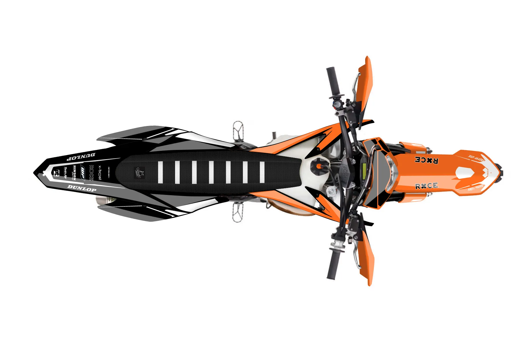«Visonary» — готовый комплект графики серии Flow для KTM Enduro Graphic Kit KTM EXC 150 2014. В комплекте: графика на бак и боковые облицовки, крылья (переднее и заднее), передний щиток, номерные таблички, защита вилки. Материал: ПВХ-винил 80 мкр с холодной ламинацией 300 мкр, общая толщина 380 мкр; покрытие глянцевое или матовое на выбор. Устойчив к UV-излучению, воде, бензину и мойке высокого давления. Клей акриловый на сольвентной основе — постоянный, для гибких пластиков. На простых поверхностях монтируется без нагрева; для сложных изгибов рекомендуем фен. Этот пресет можно заказать как есть или взять за основу в конструкторе: поменять цвета, добавить стартовый номер и свой бренд. Производство — 3–5 рабочих дней, доставка по России СДЭКом или Почтой, по СНГ — курьерскими службами.