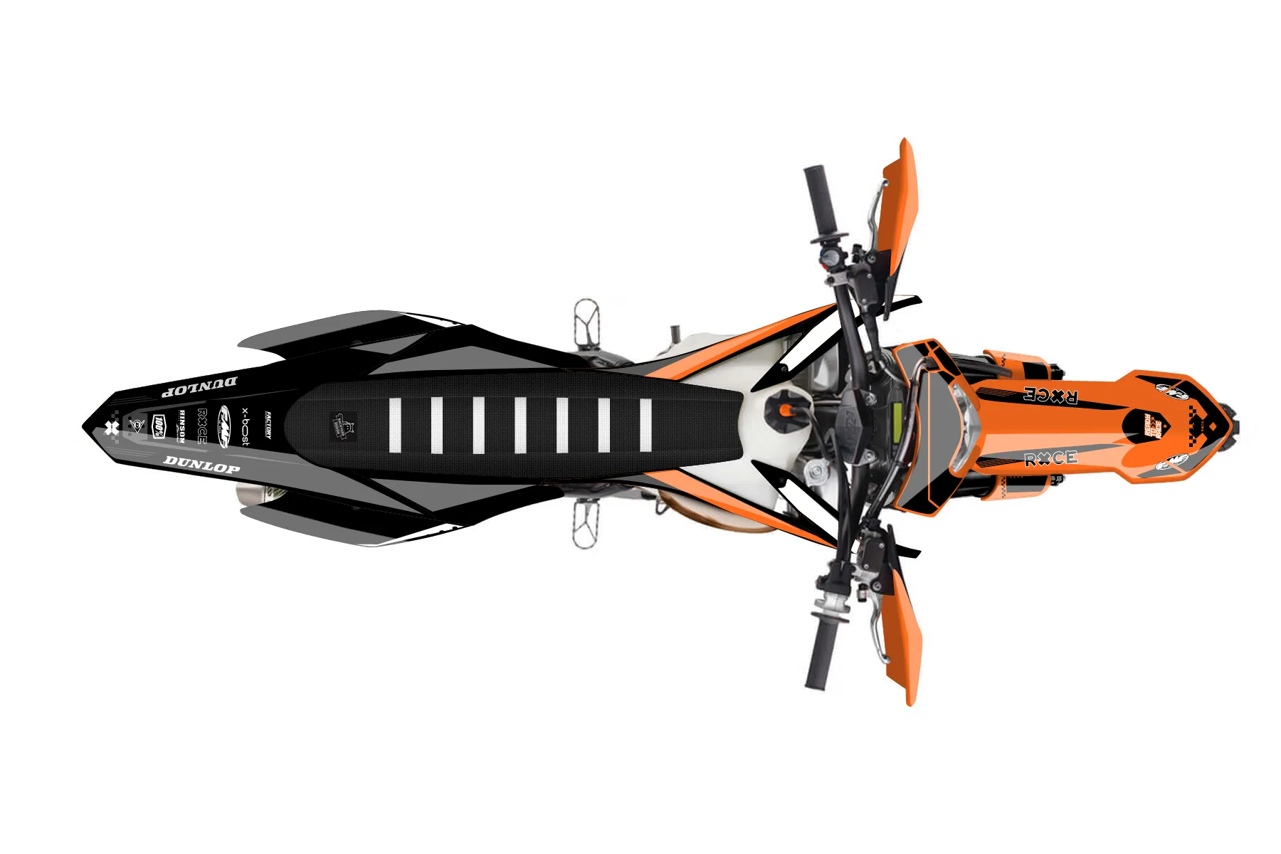 «RacerX» — готовый комплект графики серии Staple для KTM Enduro Graphic Kit KTM EXC 150 2014. В комплекте: графика на бак и боковые облицовки, крылья (переднее и заднее), передний щиток, номерные таблички, защита вилки. Материал: ПВХ-винил 80 мкр с холодной ламинацией 300 мкр, общая толщина 380 мкр; покрытие глянцевое или матовое на выбор. Устойчив к UV-излучению, воде, бензину и мойке высокого давления. Клей акриловый на сольвентной основе — постоянный, для гибких пластиков. На простых поверхностях монтируется без нагрева; для сложных изгибов рекомендуем фен. Этот пресет можно заказать как есть или взять за основу в конструкторе: поменять цвета, добавить стартовый номер и свой бренд. Производство — 3–5 рабочих дней, доставка по России СДЭКом или Почтой, по СНГ — курьерскими службами.