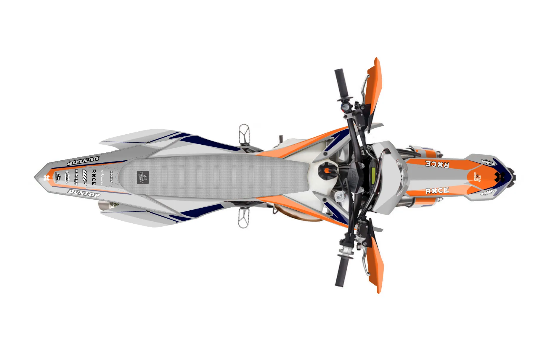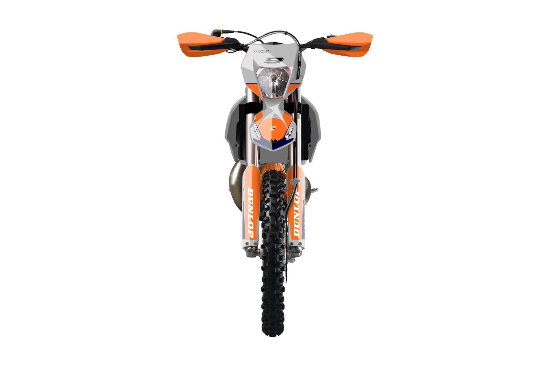 «Ride» — готовый комплект графики серии Flow для KTM Enduro Graphic Kit KTM EXC 150 2016. В комплекте: графика на бак и боковые облицовки, крылья (переднее и заднее), передний щиток, номерные таблички, защита вилки. Материал: ПВХ-винил 80 мкр с холодной ламинацией 300 мкр, общая толщина 380 мкр; покрытие глянцевое или матовое на выбор. Устойчив к UV-излучению, воде, бензину и мойке высокого давления. Клей акриловый на сольвентной основе — постоянный, для гибких пластиков. На простых поверхностях монтируется без нагрева; для сложных изгибов рекомендуем фен. Этот пресет можно заказать как есть или взять за основу в конструкторе: поменять цвета, добавить стартовый номер и свой бренд. Производство — 3–5 рабочих дней, доставка по России СДЭКом или Почтой, по СНГ — курьерскими службами.