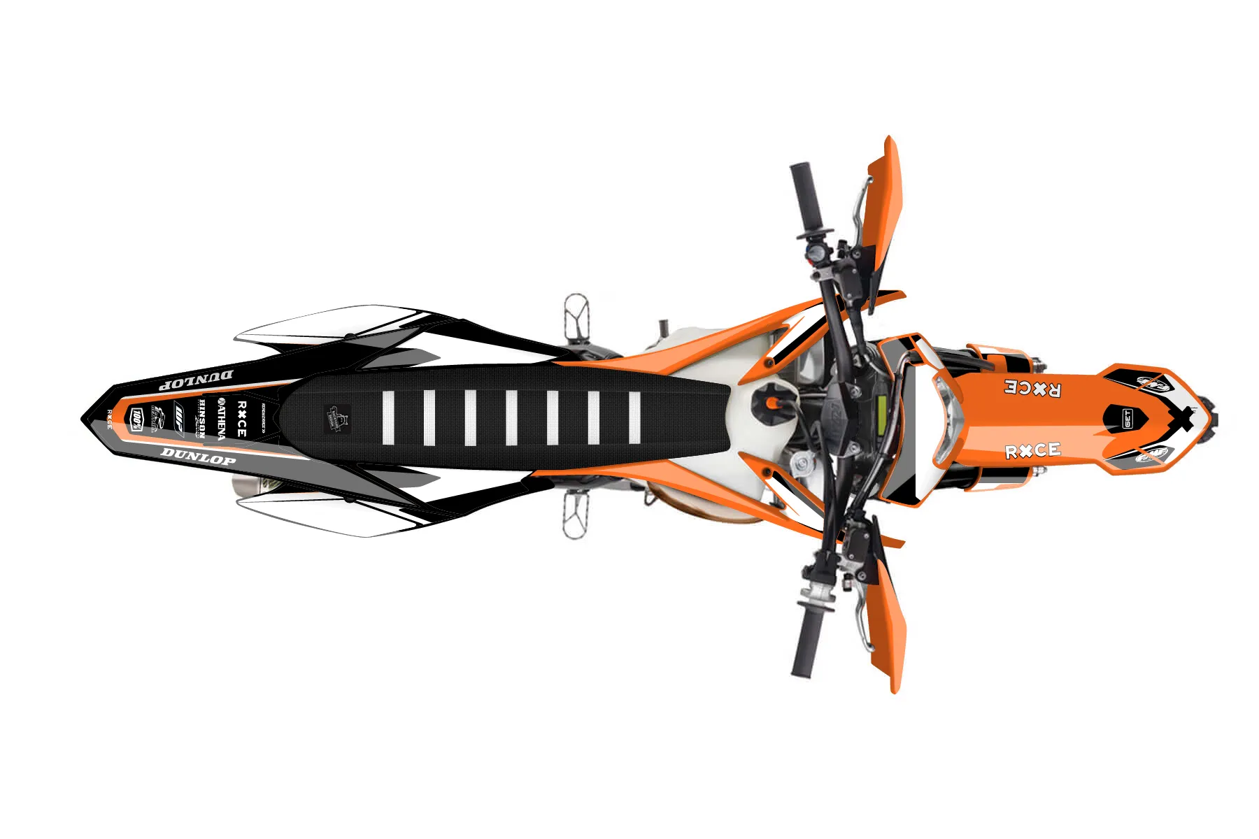 «Spotlight» — готовый комплект графики серии Flow для KTM Enduro Graphic Kit KTM EXC 150 2016. В комплекте: графика на бак и боковые облицовки, крылья (переднее и заднее), передний щиток, номерные таблички, защита вилки. Материал: ПВХ-винил 80 мкр с холодной ламинацией 300 мкр, общая толщина 380 мкр; покрытие глянцевое или матовое на выбор. Устойчив к UV-излучению, воде, бензину и мойке высокого давления. Клей акриловый на сольвентной основе — постоянный, для гибких пластиков. На простых поверхностях монтируется без нагрева; для сложных изгибов рекомендуем фен. Этот пресет можно заказать как есть или взять за основу в конструкторе: поменять цвета, добавить стартовый номер и свой бренд. Производство — 3–5 рабочих дней, доставка по России СДЭКом или Почтой, по СНГ — курьерскими службами.