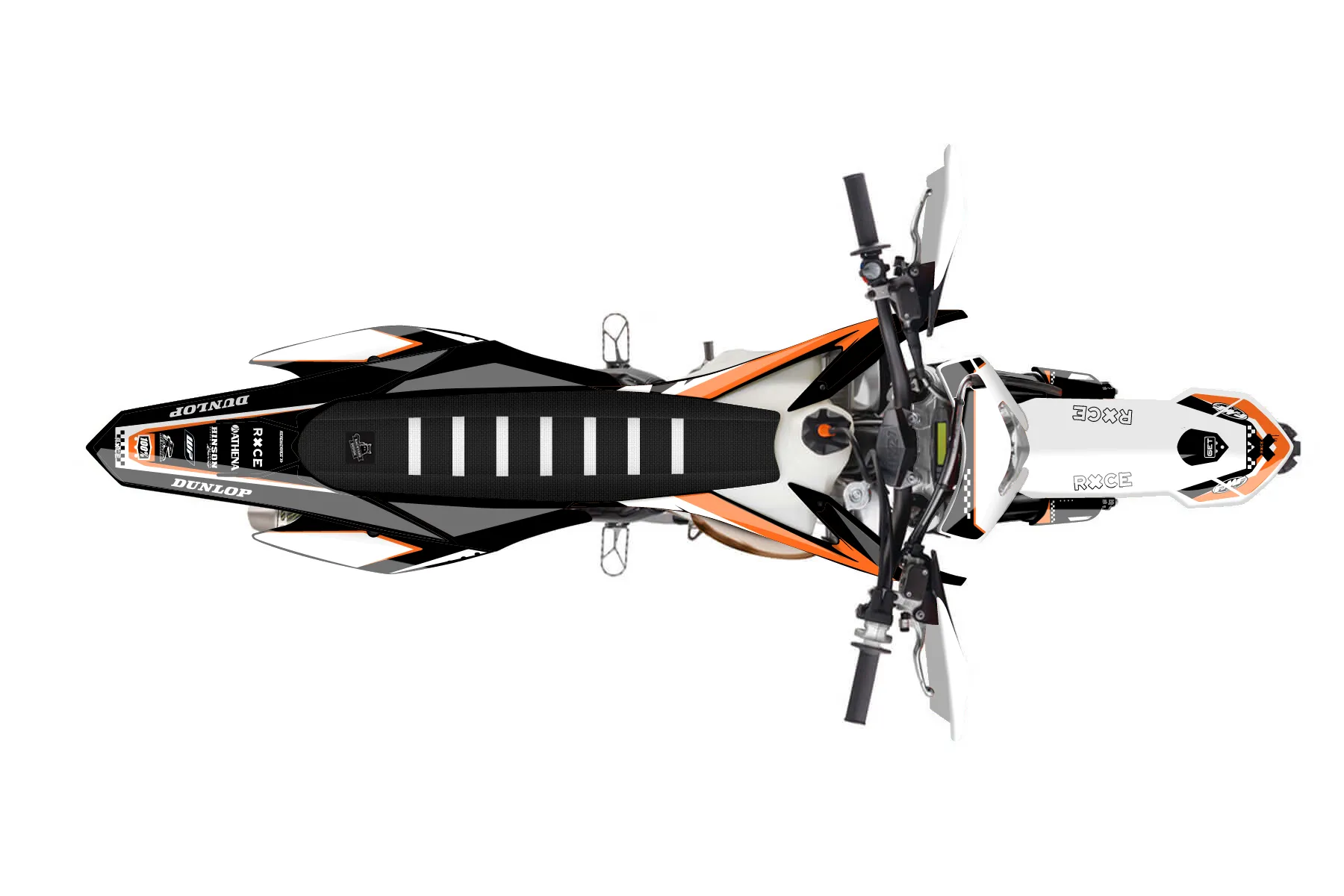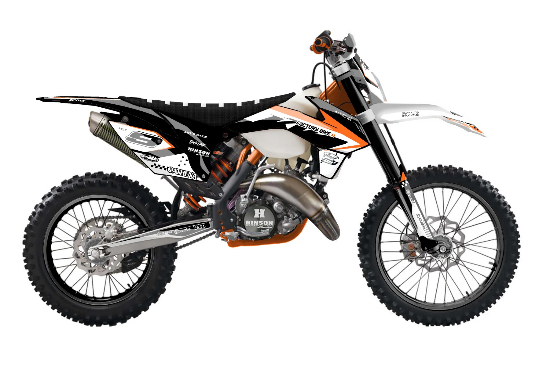 «Chef» — готовый комплект графики серии Staple для KTM Enduro Graphic Kit KTM EXC 150 2016. В комплекте: графика на бак и боковые облицовки, крылья (переднее и заднее), передний щиток, номерные таблички, защита вилки. Материал: ПВХ-винил 80 мкр с холодной ламинацией 300 мкр, общая толщина 380 мкр; покрытие глянцевое или матовое на выбор. Устойчив к UV-излучению, воде, бензину и мойке высокого давления. Клей акриловый на сольвентной основе — постоянный, для гибких пластиков. На простых поверхностях монтируется без нагрева; для сложных изгибов рекомендуем фен. Этот пресет можно заказать как есть или взять за основу в конструкторе: поменять цвета, добавить стартовый номер и свой бренд. Производство — 3–5 рабочих дней, доставка по России СДЭКом или Почтой, по СНГ — курьерскими службами.