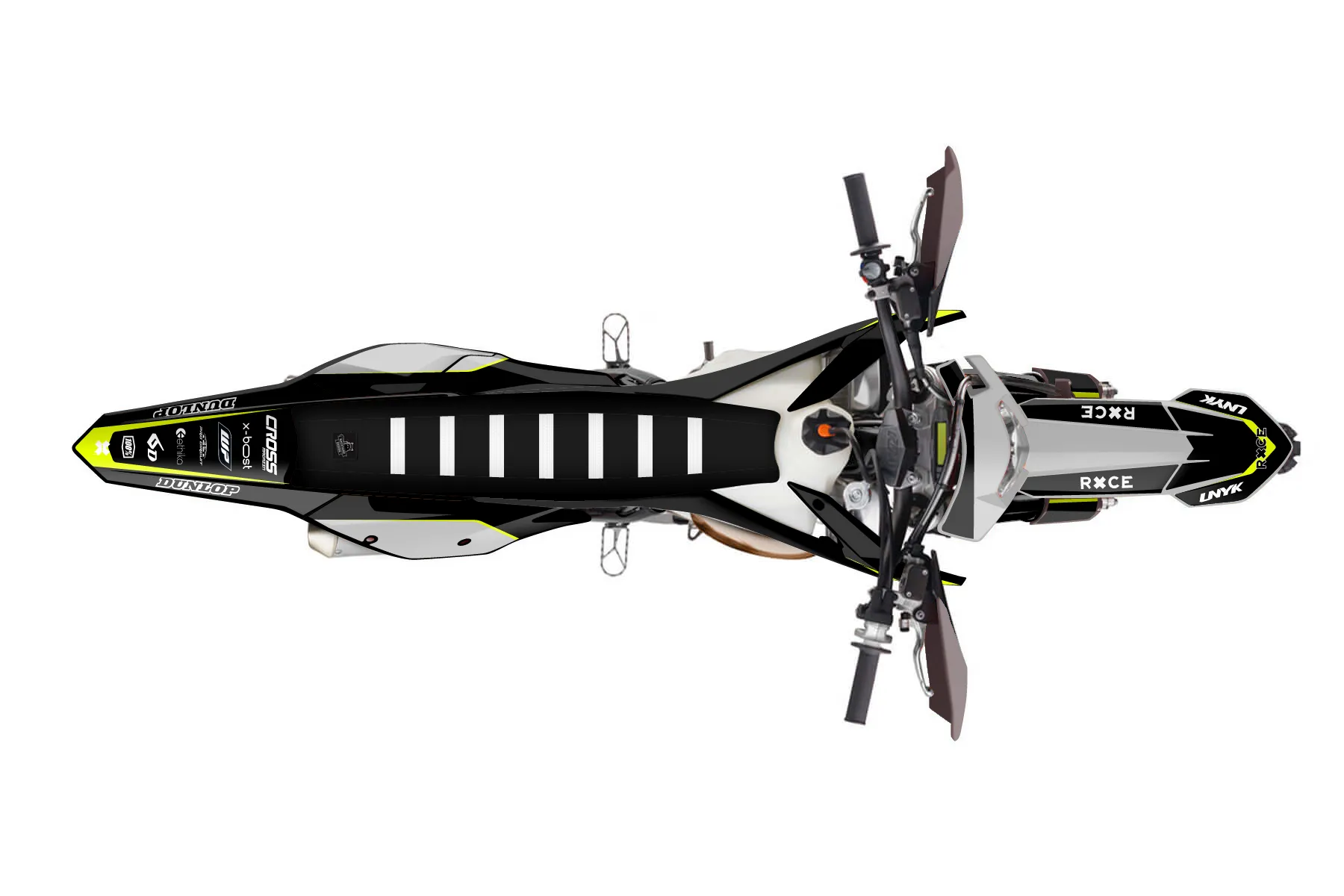«Fluo» — готовый комплект графики серии Flow для KTM Enduro Graphic Kit KTM EXC 150 2017. В комплекте: графика на бак и боковые облицовки, крылья (переднее и заднее), передний щиток, номерные таблички, защита вилки. Материал: ПВХ-винил 80 мкр с холодной ламинацией 300 мкр, общая толщина 380 мкр; покрытие глянцевое или матовое на выбор. Устойчив к UV-излучению, воде, бензину и мойке высокого давления. Клей акриловый на сольвентной основе — постоянный, для гибких пластиков. На простых поверхностях монтируется без нагрева; для сложных изгибов рекомендуем фен. Этот пресет можно заказать как есть или взять за основу в конструкторе: поменять цвета, добавить стартовый номер и свой бренд. Производство — 3–5 рабочих дней, доставка по России СДЭКом или Почтой, по СНГ — курьерскими службами.