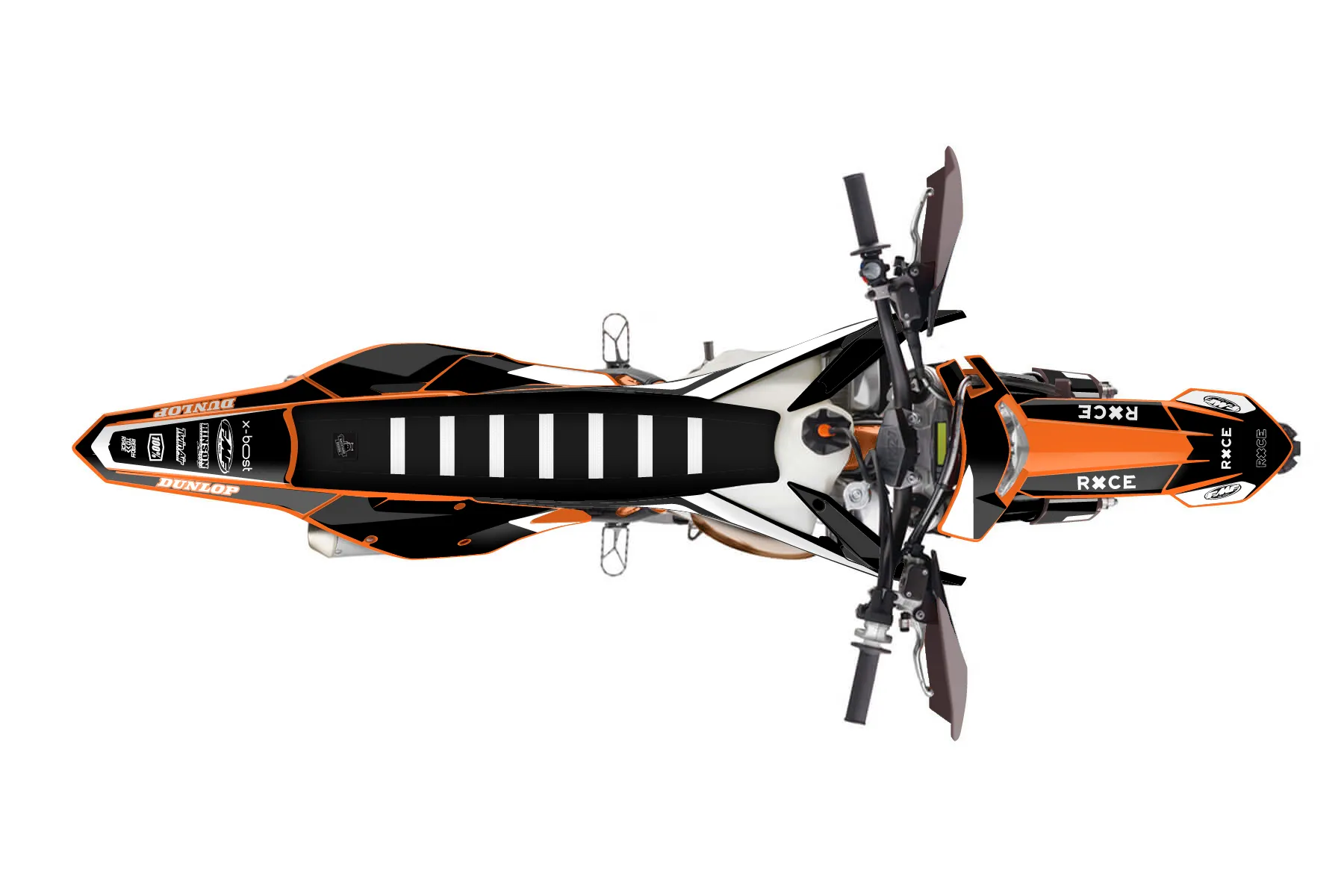 «Race» — готовый комплект графики серии Flow для KTM Enduro Graphic Kit KTM EXC 150 2017. В комплекте: графика на бак и боковые облицовки, крылья (переднее и заднее), передний щиток, номерные таблички, защита вилки. Материал: ПВХ-винил 80 мкр с холодной ламинацией 300 мкр, общая толщина 380 мкр; покрытие глянцевое или матовое на выбор. Устойчив к UV-излучению, воде, бензину и мойке высокого давления. Клей акриловый на сольвентной основе — постоянный, для гибких пластиков. На простых поверхностях монтируется без нагрева; для сложных изгибов рекомендуем фен. Этот пресет можно заказать как есть или взять за основу в конструкторе: поменять цвета, добавить стартовый номер и свой бренд. Производство — 3–5 рабочих дней, доставка по России СДЭКом или Почтой, по СНГ — курьерскими службами.