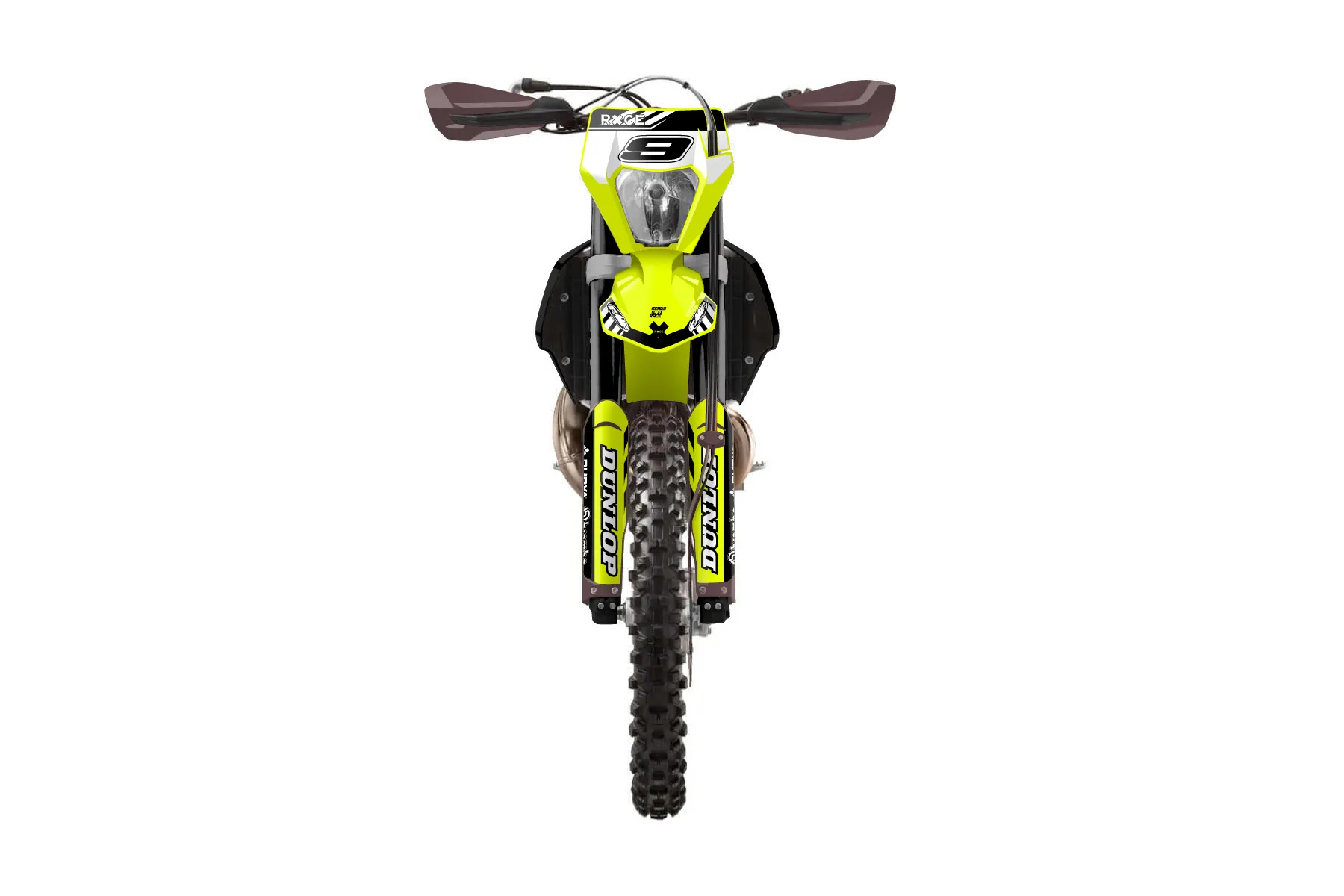 «Volt Neon» — готовый комплект графики серии Maverick для KTM Enduro Graphic Kit KTM EXC 150 2017. В комплекте: графика на бак и боковые облицовки, крылья (переднее и заднее), передний щиток, номерные таблички, защита вилки. Материал: ПВХ-винил 80 мкр с холодной ламинацией 300 мкр, общая толщина 380 мкр; покрытие глянцевое или матовое на выбор. Устойчив к UV-излучению, воде, бензину и мойке высокого давления. Клей акриловый на сольвентной основе — постоянный, для гибких пластиков. На простых поверхностях монтируется без нагрева; для сложных изгибов рекомендуем фен. Этот пресет можно заказать как есть или взять за основу в конструкторе: поменять цвета, добавить стартовый номер и свой бренд. Производство — 3–5 рабочих дней, доставка по России СДЭКом или Почтой, по СНГ — курьерскими службами.