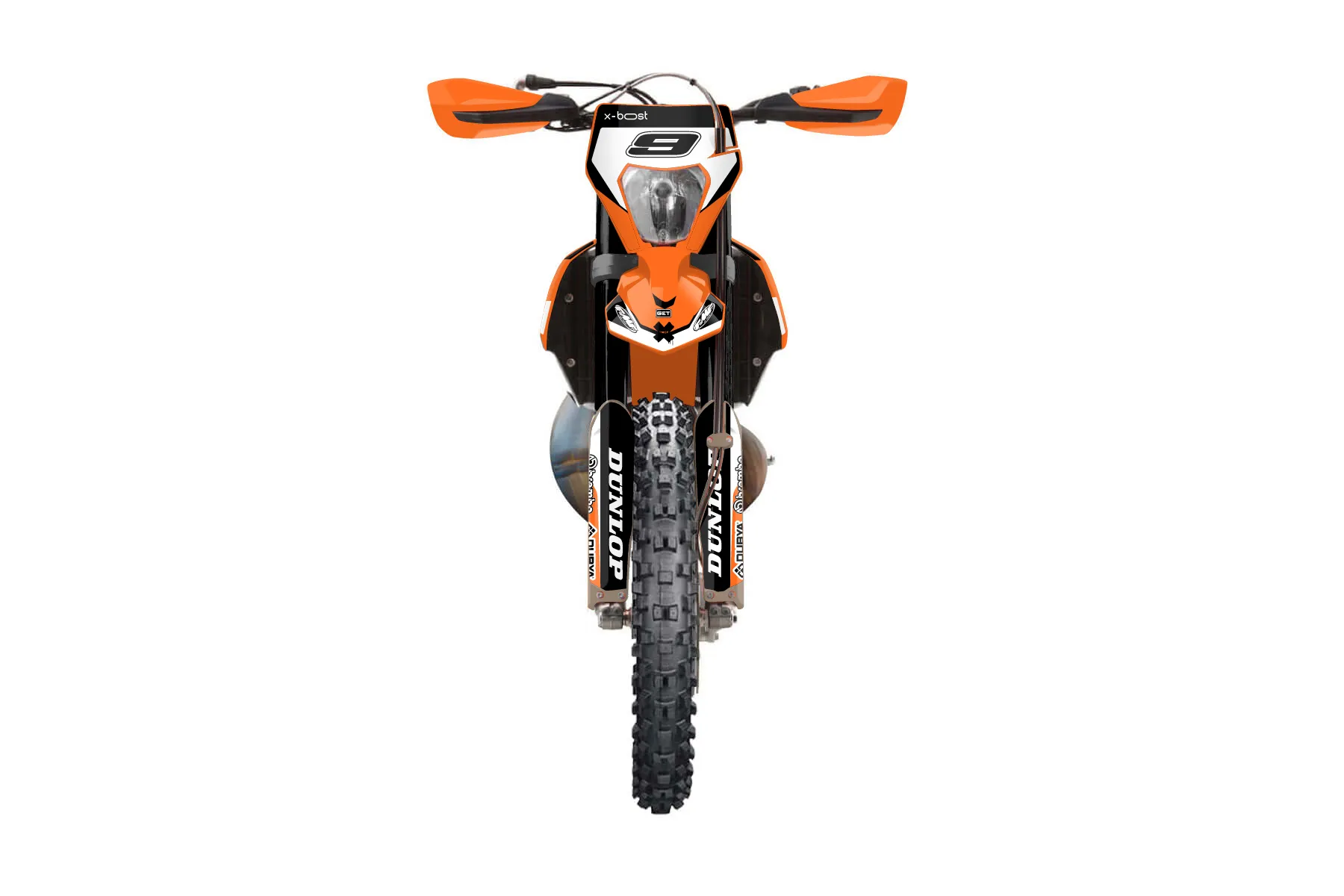 «Spotlight» — готовый комплект графики серии Flow для KTM Enduro Graphic Kit KTM EXC 150 2020. В комплекте: графика на бак и боковые облицовки, крылья (переднее и заднее), передний щиток, номерные таблички, защита вилки. Материал: ПВХ-винил 80 мкр с холодной ламинацией 300 мкр, общая толщина 380 мкр; покрытие глянцевое или матовое на выбор. Устойчив к UV-излучению, воде, бензину и мойке высокого давления. Клей акриловый на сольвентной основе — постоянный, для гибких пластиков. На простых поверхностях монтируется без нагрева; для сложных изгибов рекомендуем фен. Этот пресет можно заказать как есть или взять за основу в конструкторе: поменять цвета, добавить стартовый номер и свой бренд. Производство — 3–5 рабочих дней, доставка по России СДЭКом или Почтой, по СНГ — курьерскими службами.